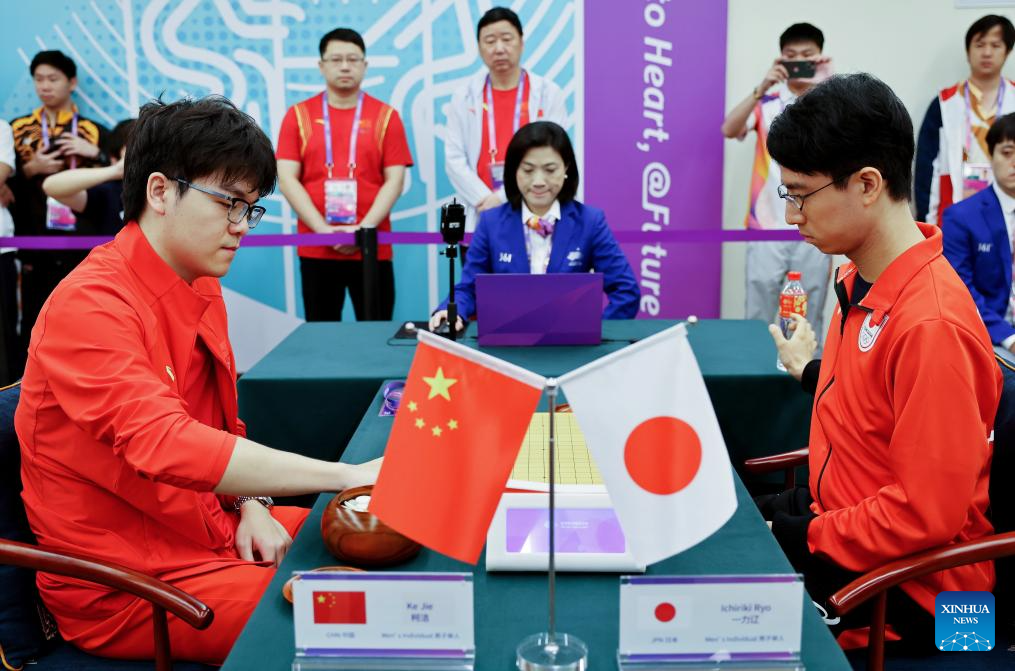 Ichiriki Ryo (R) of Japan competes against Ke Jie of China during the Men's Individual Semifinal of Go Chess at the 19th Asian Games in Hangzhou, east China's Zhejiang Province, Sept. 28, 2023. (Xinhua/Gong Bing)