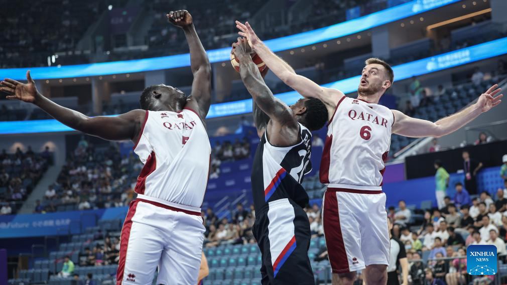 Guna RA (C) of South Korea grabs rebound during the Men's Preliminary Round Group D match of Basketball between South Korea and Qatar at the 19th Asian Games in Hangzhou, east China's Zhejiang Province, Sept. 28, 2023. (Xinhua/Pan Yulong)