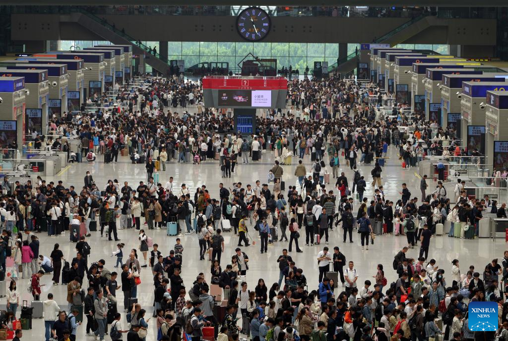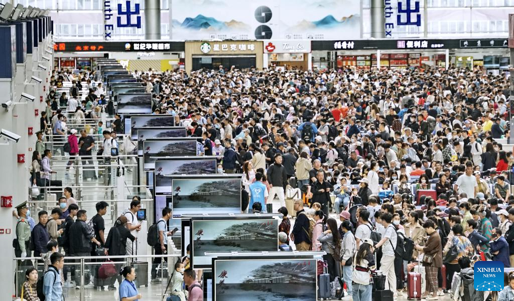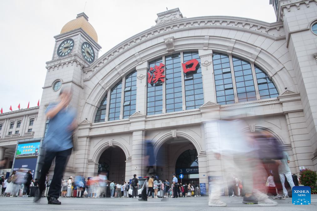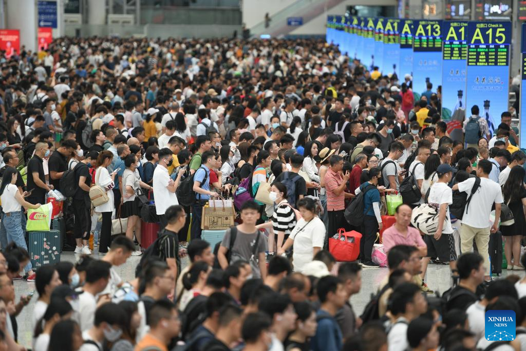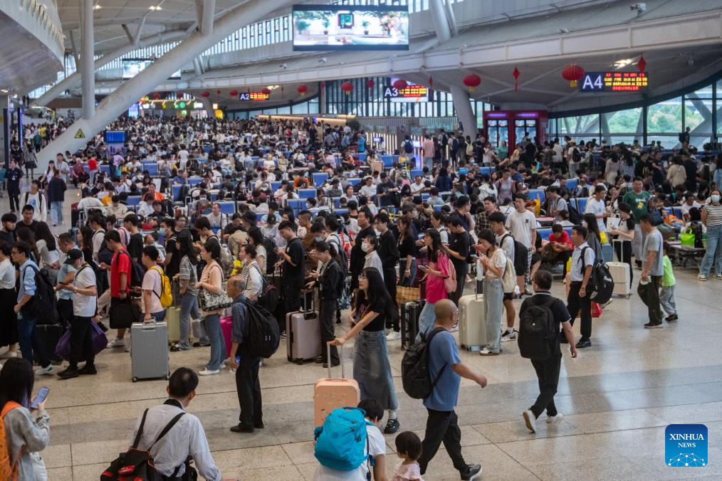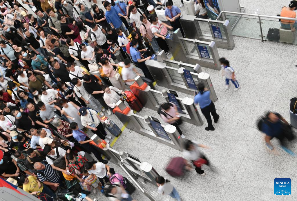 Passengers are seen at Wuhan Railway Station in Wuhan, central China's Hubei Province, Sept. 28, 2023. The Mid-Autumn Festival and National Day holiday period, which will last from Sept. 29 to Oct. 6 this year, is a peak travel and tourism season in China. (Photo by Du Zixuan/Xinhua)