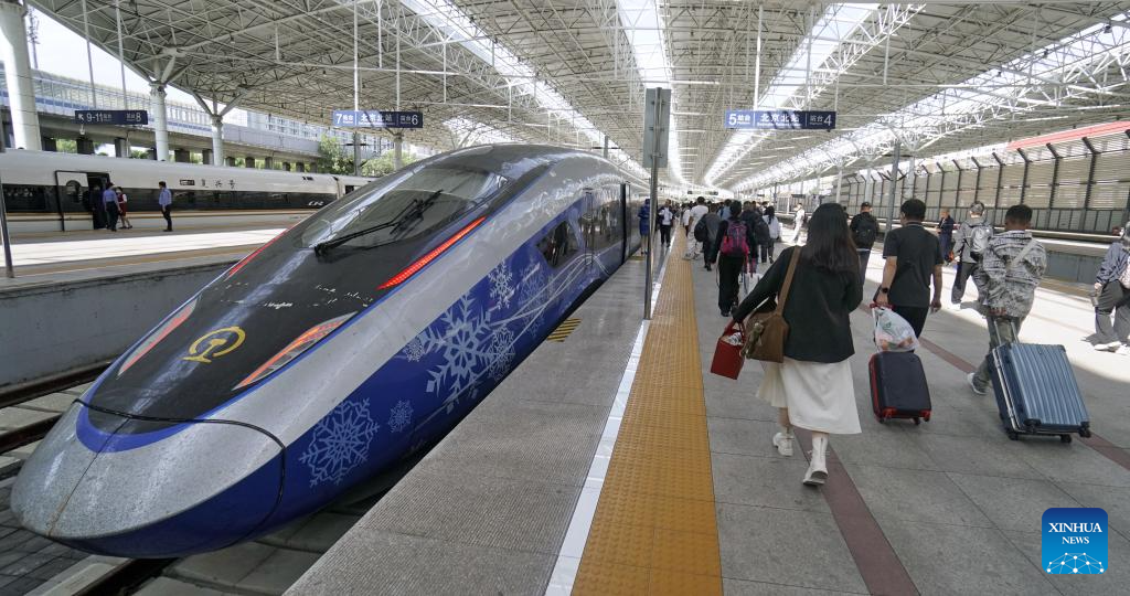 Passengers prepare to board a train at Beijing North Railway Station in Beijing, capital of China, Sept. 28, 2023. The Mid-Autumn Festival and National Day holiday period, which will last from Sept. 29 to Oct. 6 this year, is a peak travel and tourism season in China. (Xinhua/Li Xin)
