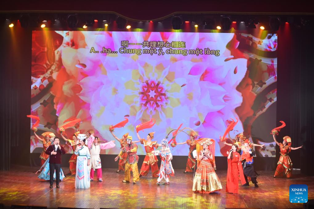 Actors perform at a gala celebrating the Mid-Autumn Festival in Hanoi, Vietnam, Sept. 20, 2023. Various celebrations are held across the world with the approaching of Mid-Autumn Festival. (Xinhua/Hu Jiali)