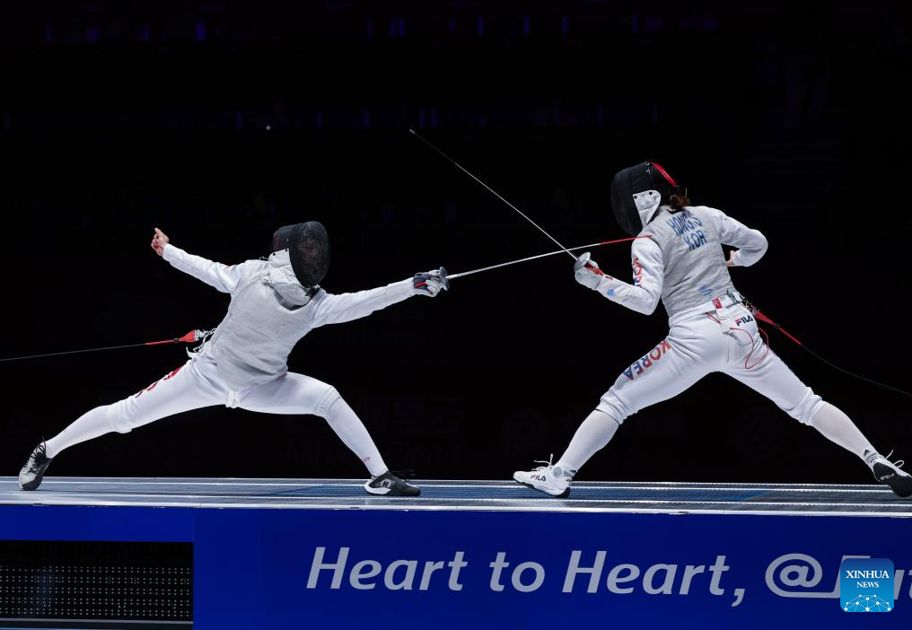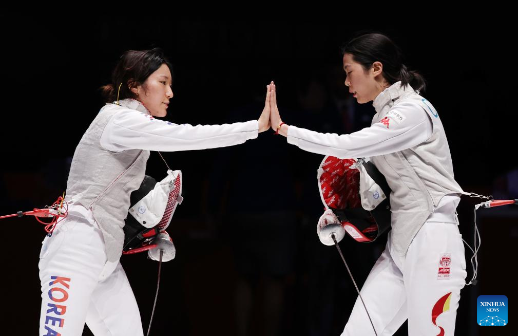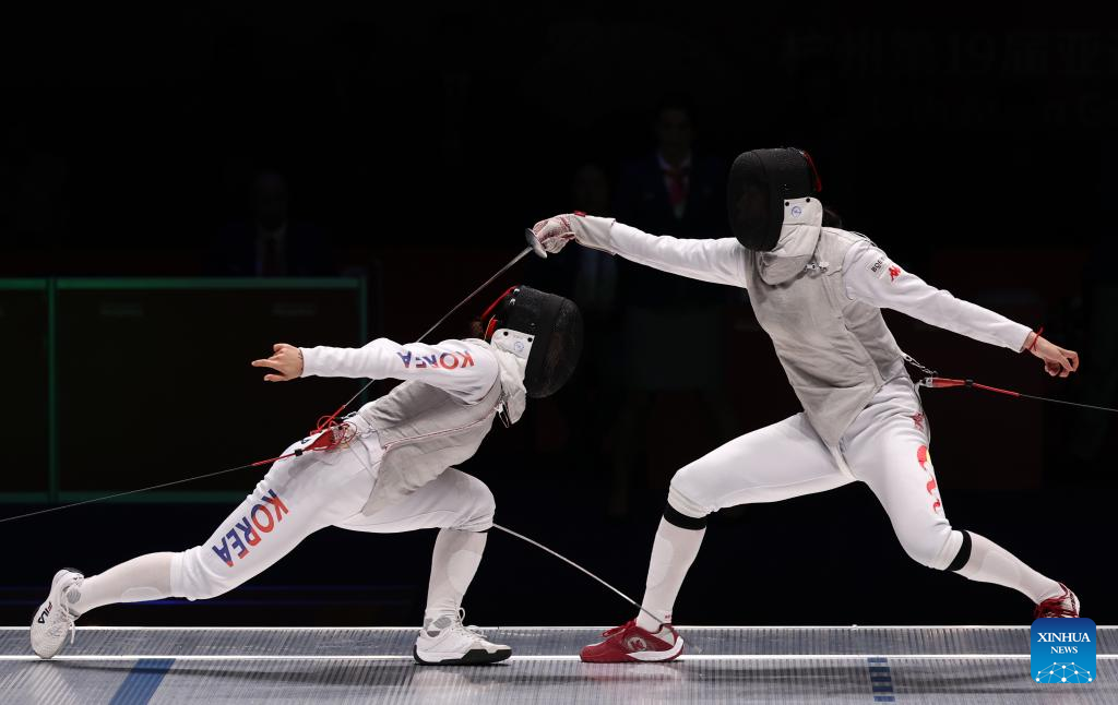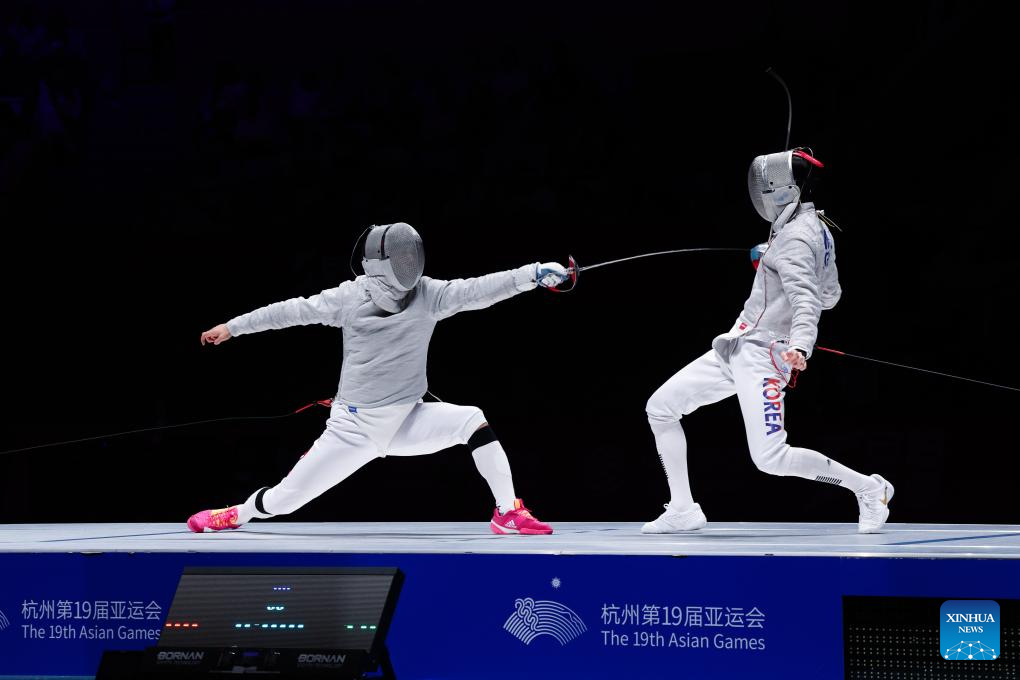 HANGZHOU, Sept. 28 (Xinhua) -- China and South Korea met in both finals on the fencing piste at the Hangzhou Asian Games on Thursday, with the hosts clinching the women's foil team title and South Korea taking their third consecutive men's sabre team gold.