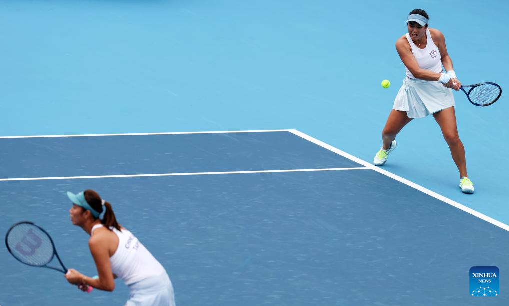 Chan Hao-ching/Chan Yung-jan of Chinese Taipei compete during the Women's Doubles Semifinal Match of Tennis between Chinese Taipei and Indonesia at the 19th Asian Games in Hangzhou, east China's Zhejiang Province, Sept. 28, 2023. (Xinhua/Meng Chenguang)