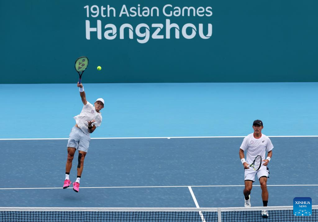 Jung Jason/Hsu Yu-hsiou of Chinese Taipei compete during the Men's Doubles Semifinal Match of Tennis between Pruchya Isaro/Maximus Parapol Jones of Thailand and Jung Jason/Hsu Yu-hsiou of Chinese Taipei at the 19th Asian Games in Hangzhou, east China's Zhejiang Province, Sept. 28, 2023. (Xinhua/Meng Chenguang)