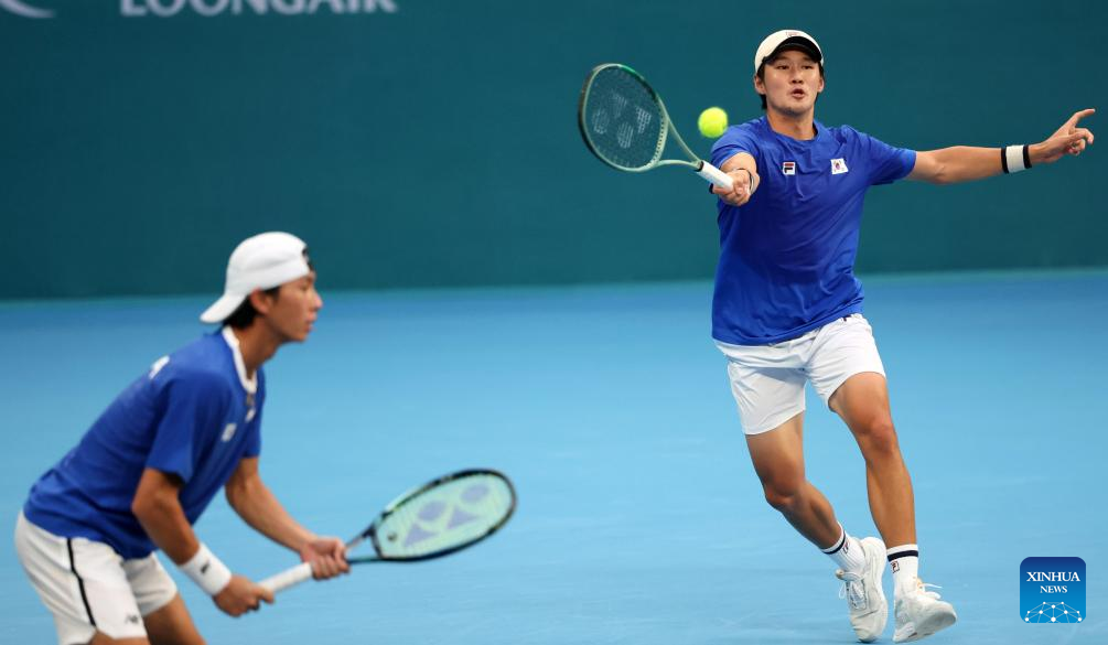 Kwon Soonwoo/Hong Seongchan of South Korea compete during the Men's Doubles Semifinal Match of Tennis between India and South Korea at the 19th Asian Games in Hangzhou, east China's Zhejiang Province, Sept. 28, 2023. (Xinhua/Meng Chenguang)