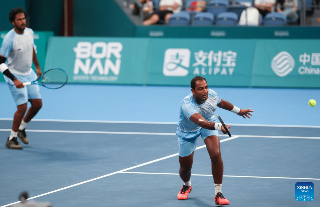 Saketh Myneni/Ramkumar Ramanathan of India compete during the Men's Doubles Semifinal Match of Tennis between India and South Korea at the 19th Asian Games in Hangzhou, east China's Zhejiang Province, Sept. 28, 2023. (Xinhua/Meng Chenguang)