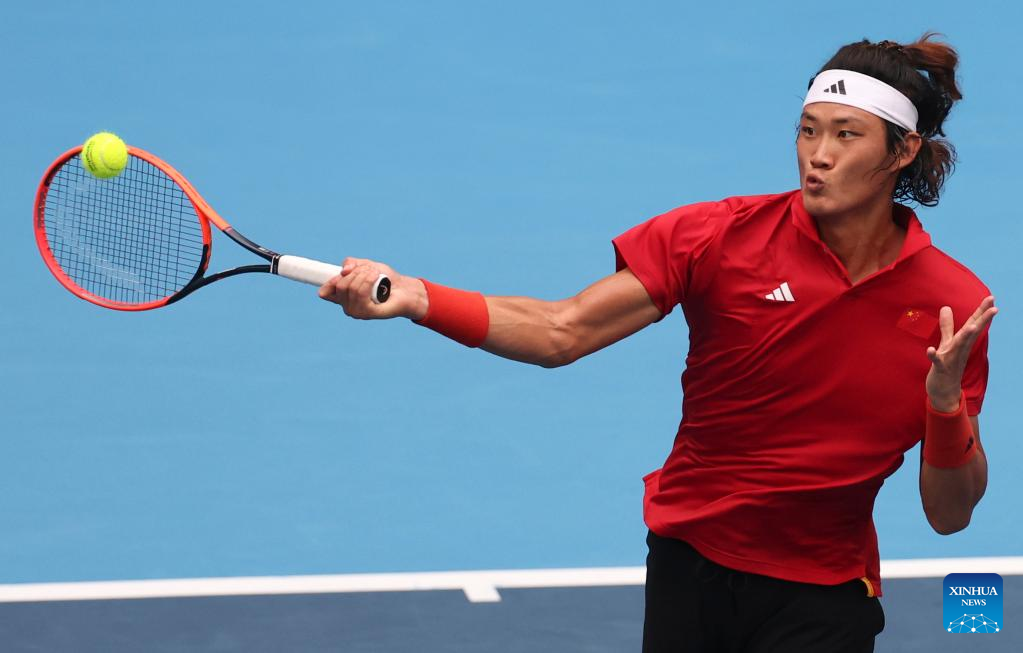 Zhang Zhizhen of China competes during the Men's Singles Semifinal match of Tennis between Zhang Zhizhen of China and Khumoyun Sultanov of Uzbekistan at the 19th Asian Games in Hangzhou, east China's Zhejiang Province, Sept. 28, 2023. (Xinhua/Meng Chenguang)