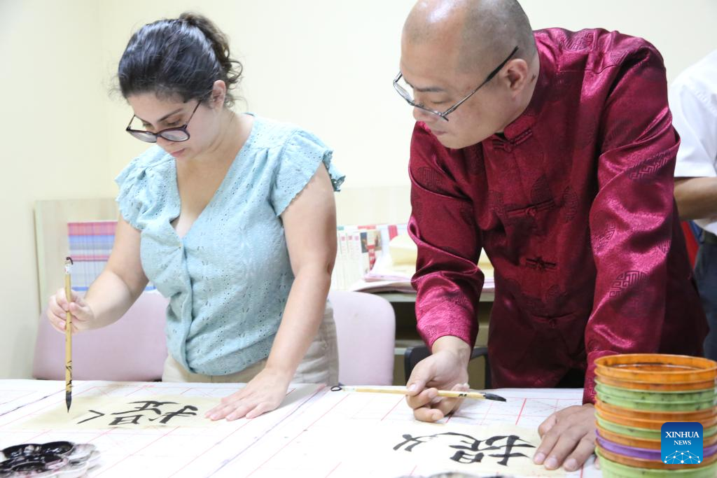 A woman tries Chinese calligraphy during a celebration of the Chinese Mid-Autumn Festival in Valletta, Malta, on Sept, 28, 2023. The China Cultural Center in Malta on Thursday evening hosted a vibrant celebration of the Chinese Mid-Autumn Festival, showcasing a delightful array of activities, including music, mooncake making and tasting, lantern crafting, and calligraphy. (Xinhua/Chen Wenxian)