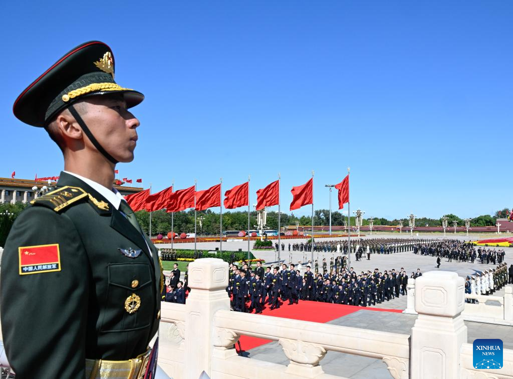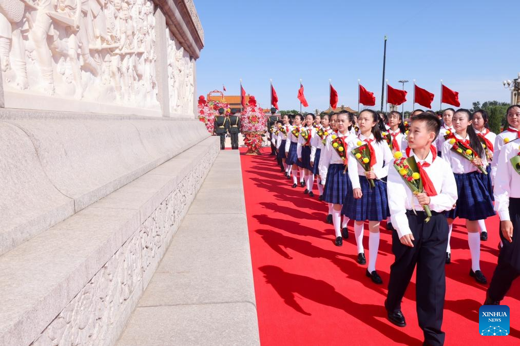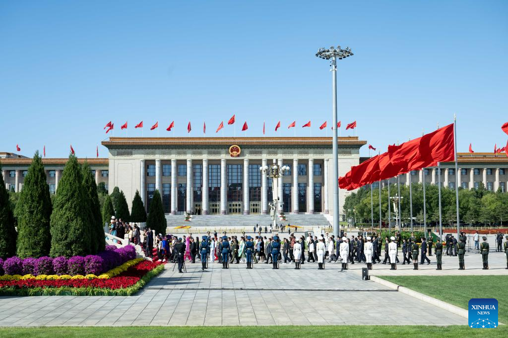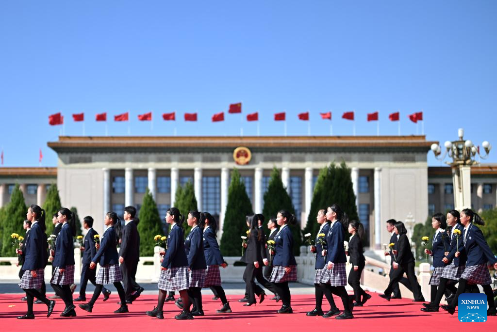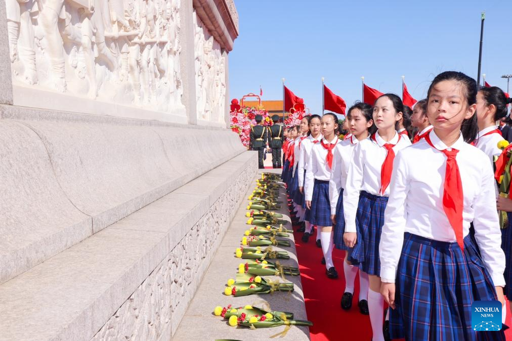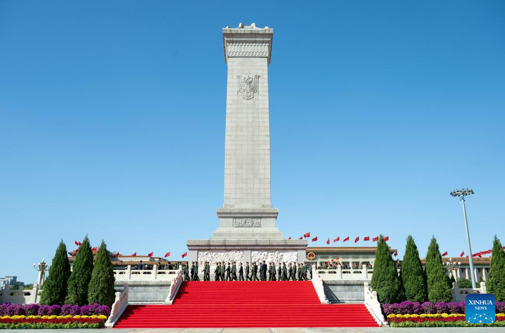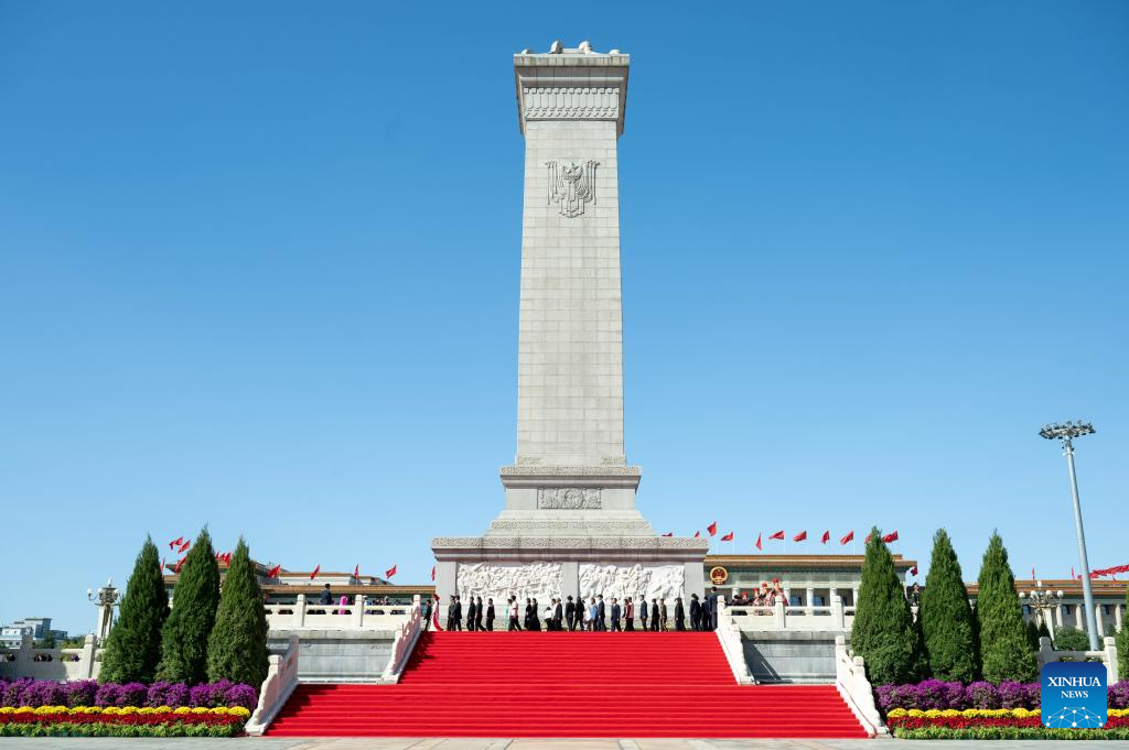 A ceremony presenting flower baskets to fallen national heroes to mark the Martyrs' Day is held in Tian'anmen Square in Beijing, capital of China, Sept. 30, 2023. (Xinhua/Zhai Jianlan)
