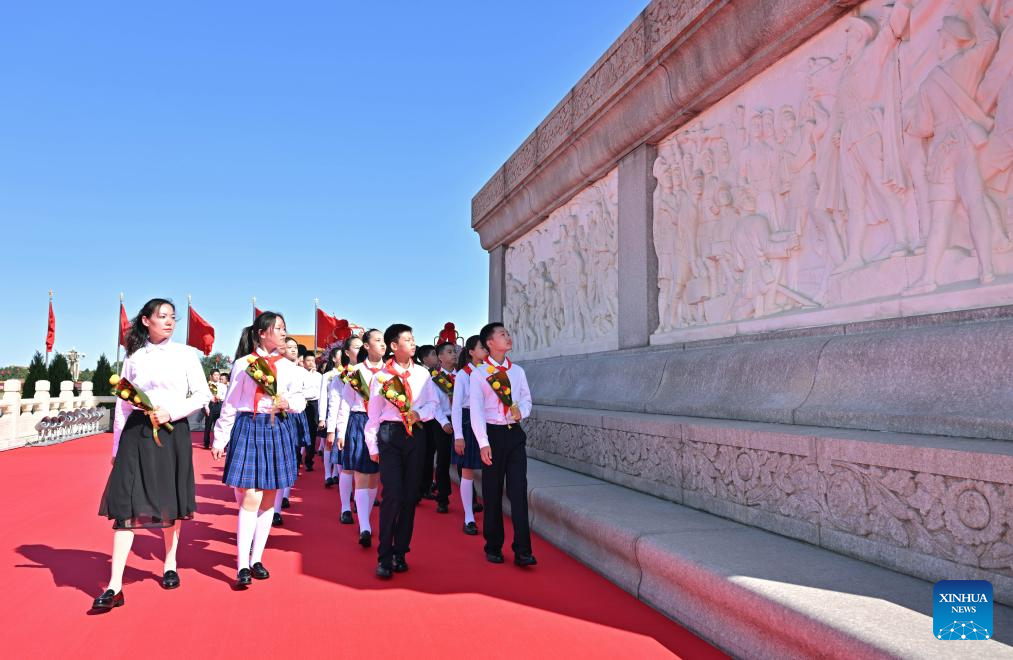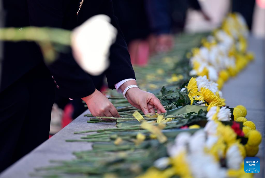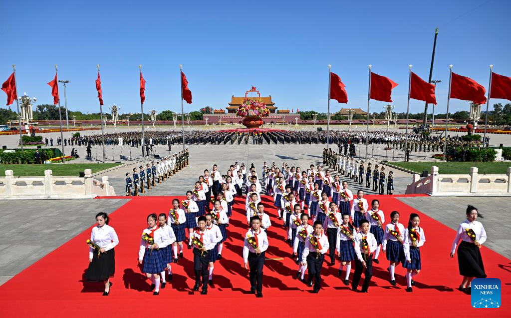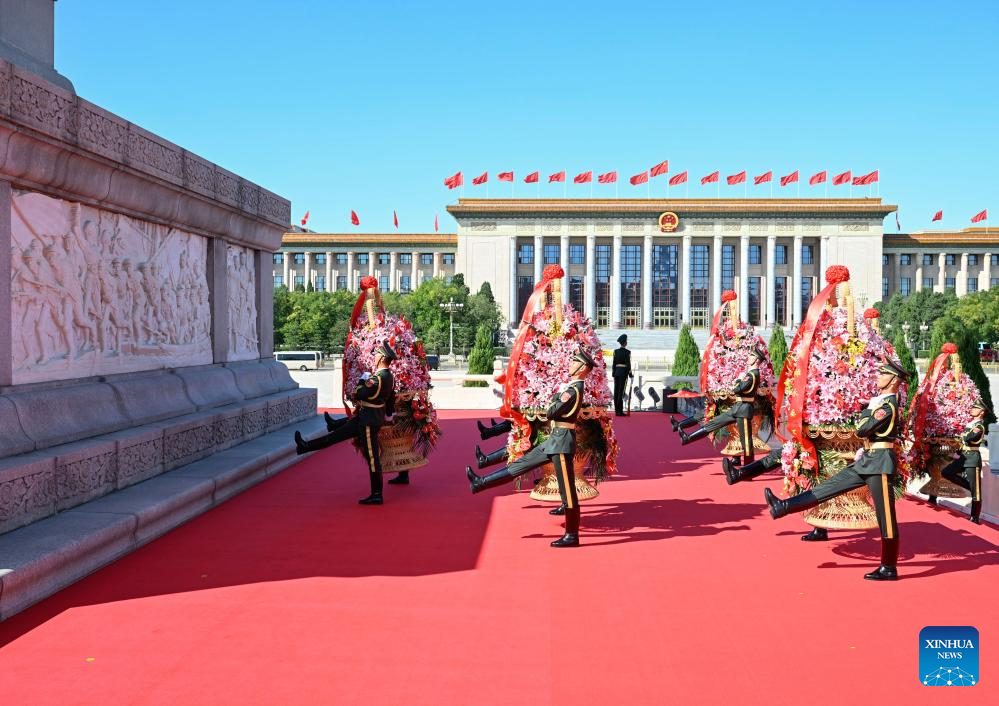 A ceremony presenting flower baskets to fallen national heroes to mark the Martyrs' Day is held in Tian'anmen Square in Beijing, capital of China, Sept. 30, 2023. (Xinhua/Rao Aimin)