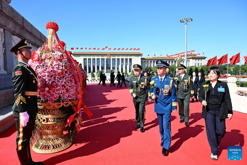 A ceremony presenting flower baskets to fallen national heroes to mark the Martyrs' Day is held in Tian'anmen Square in Beijing, capital of China, Sept. 30, 2023. (Xinhua/Liu Bin)