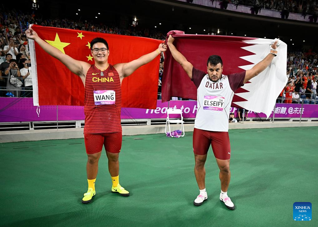 Wang Qi (L) of China and Ashraf Elseify of Qatar celebrate after the Men's Hammer Throw Final of Athletics at the 19th Asian Games in Hangzhou, east China's Zhejiang Province, Sept. 30, 2023. (Xinhua/Song Yanhua)