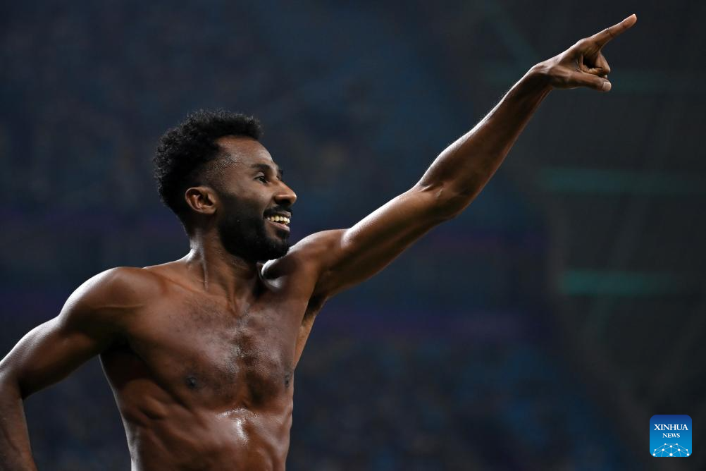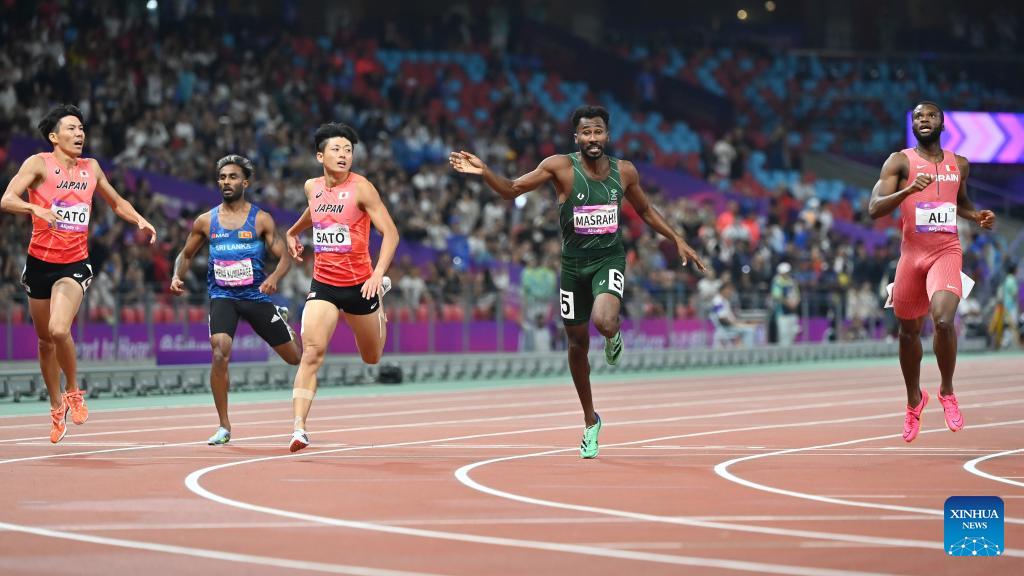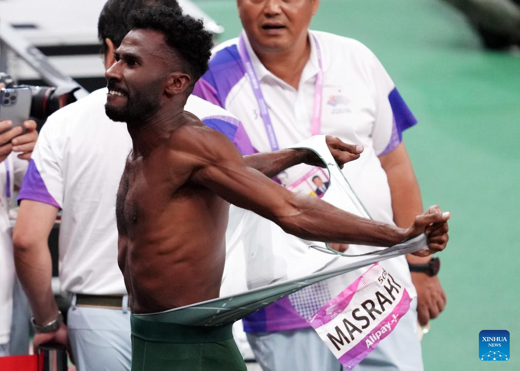 Yousef Ahmed M Masrahi of Saudi Arabia reacts after the Men's 400m Final of Athletics at the 19th Asian Games in Hangzhou, east China's Zhejiang Province, Sept. 30, 2023. (Xinhua/Song Yanhua)