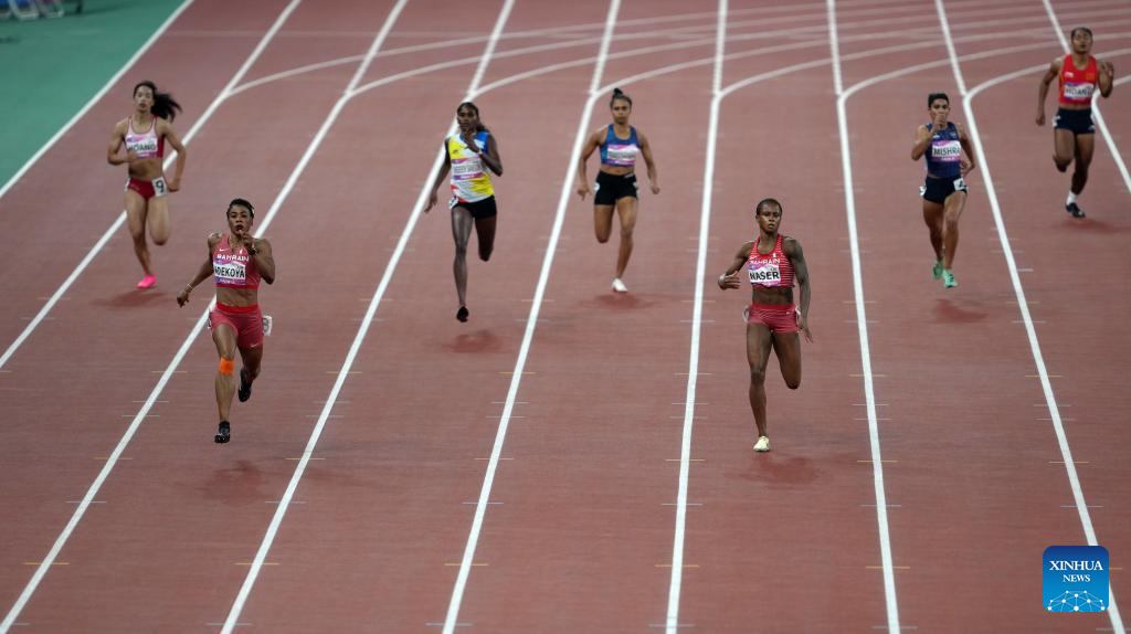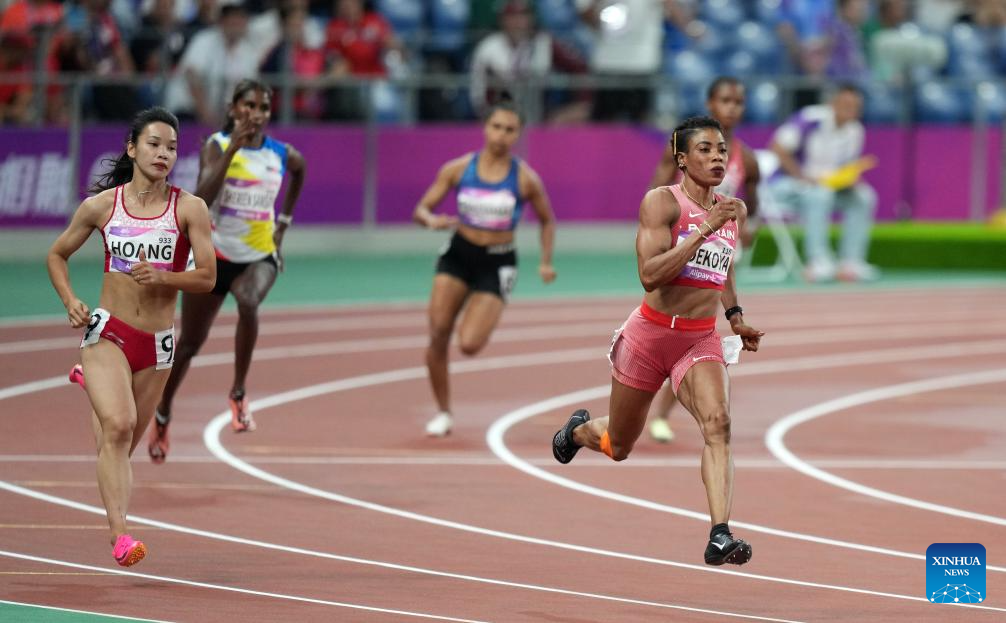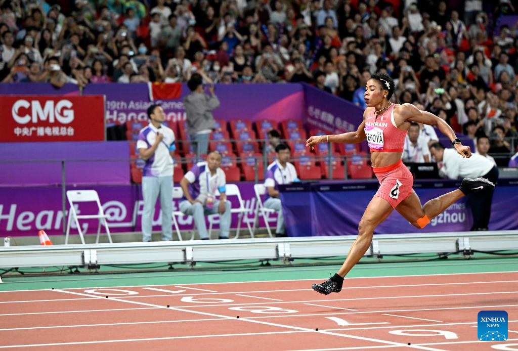 Oluwakemi Mujidat Adekoya(1st R) of Bahrain competes during the Women's 400m Final of Athletics at the 19th Asian Games in Hangzhou, east China's Zhejiang Province, Sept. 30, 2023. (Xinhua/Sun Fei)