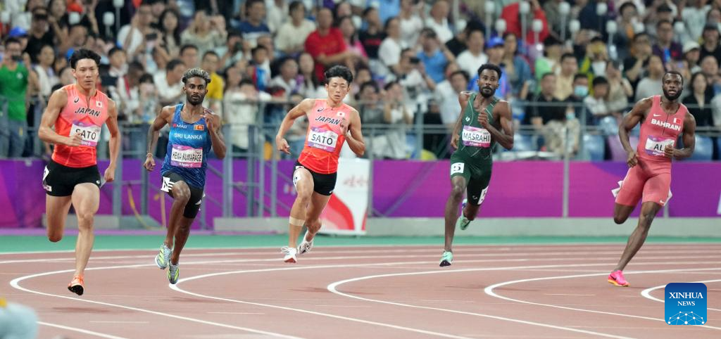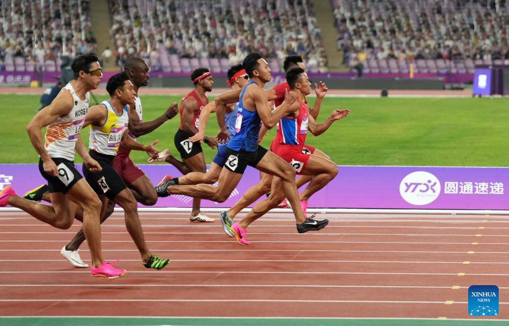 Athletes compete during the Men's 100m Semifinal of Athletics at the 19th Asian Games in Hangzhou, east China's Zhejiang Province, Sept. 30, 2023. (Xinhua/Sun Fei)