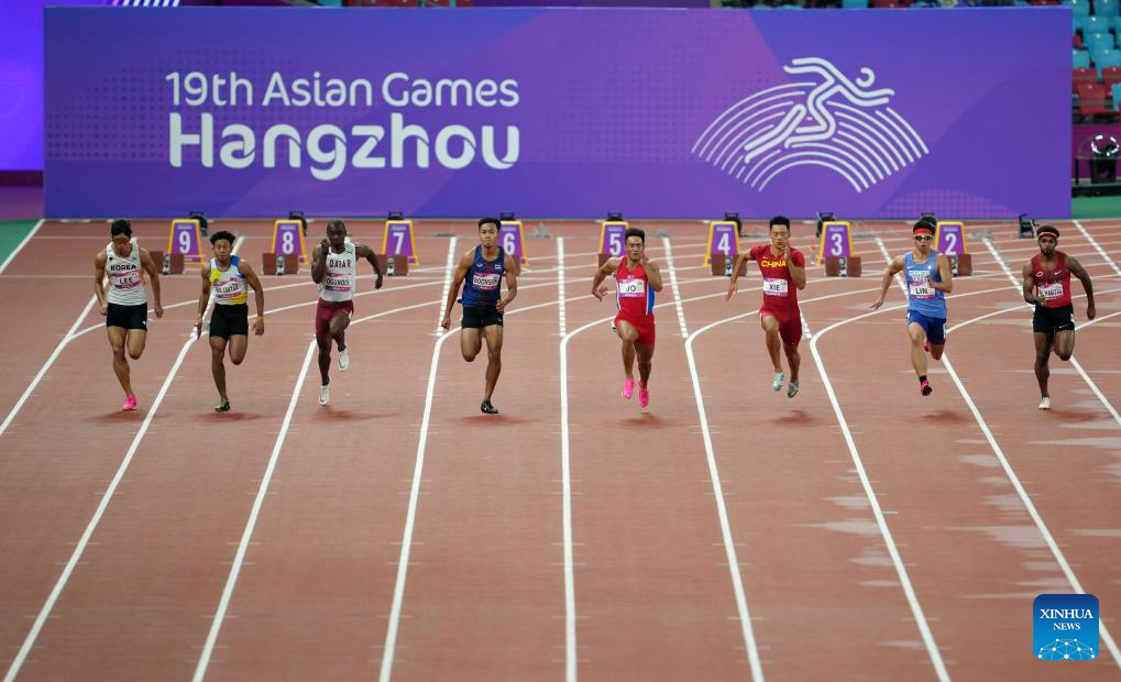 Xie Zhenye (C) of China competes during the Men's 100m Semifinal of Athletics at the 19th Asian Games in Hangzhou, east China's Zhejiang Province, Sept. 30, 2023. (Xinhua/Jiang Wenyao)