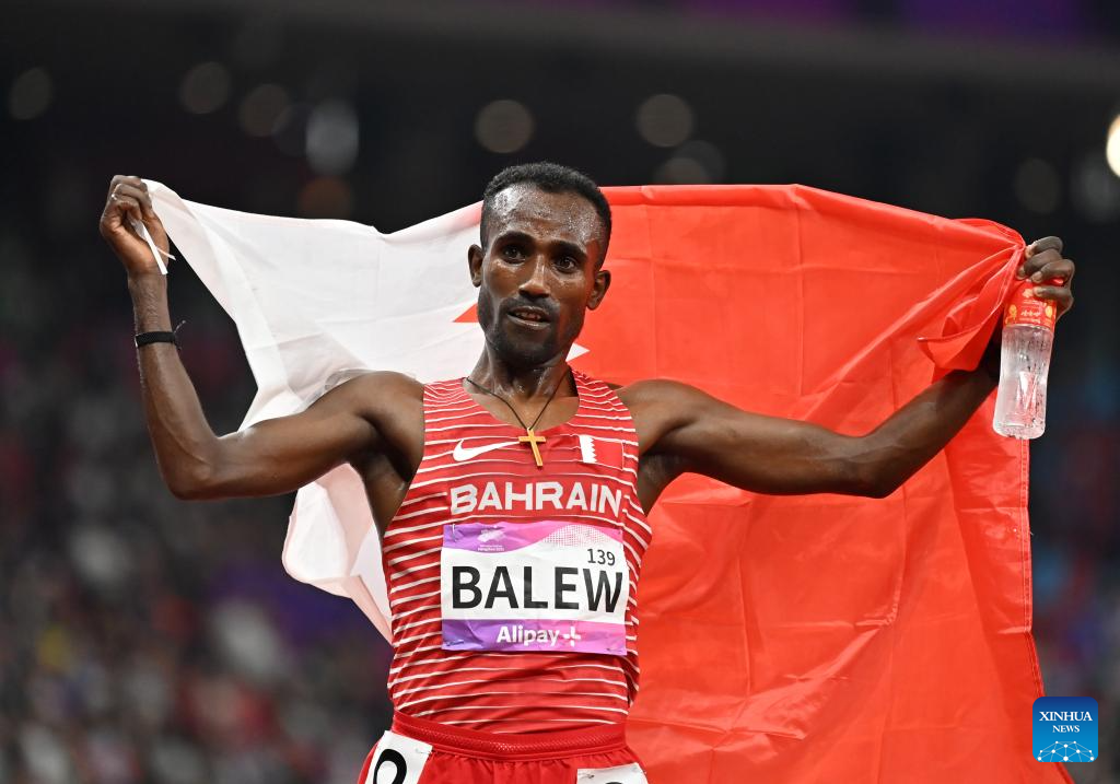 Birhanu Yemataw Balew of Bahrain reacts after the Men's 10000m Final of Athletics at the 19th Asian Games in Hangzhou, east China's Zhejiang Province, Sept. 30, 2023. (Xinhua/Jiang Han)