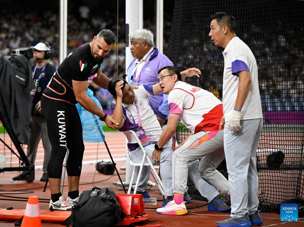 A technical official (C) gets injured during the Men's Hammer Throw Final of Athletics at the 19th Asian Games in Hangzhou, east China's Zhejiang Province, Sept. 30, 2023. (Xinhua/Song Yanhua)