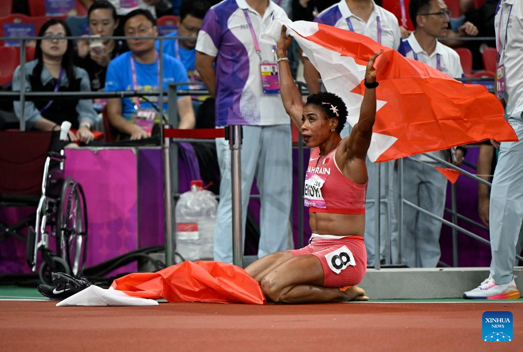 Oluwakemi Mujidat Adekoya of Bahrain reacts after the Women's 400m Final of Athletics at the 19th Asian Games in Hangzhou, east China's Zhejiang Province, Sept. 30, 2023. (Xinhua/Song Yanhua)