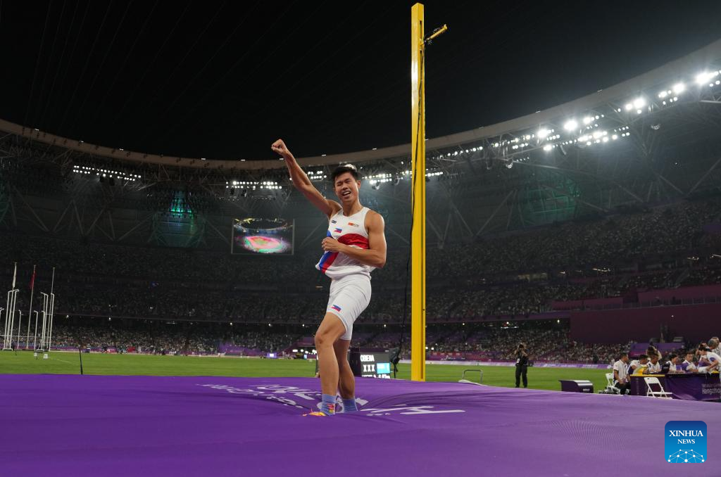 Ernest John Obiena of the Philippines celebrates after the Men's Pole Vault of Athletics at the 19th Asian Games in Hangzhou, east China's Zhejiang Province, Sept. 30, 2023. (Xinhua/Li Yibo)