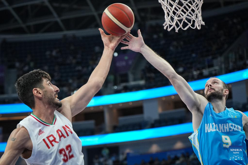 Hasan Aliakbari (L) of Iran competes during the Men's Preliminary Round Group match of Basketball between Iran and Kazakhstan at the 19th Asian Games in Hangzhou, east China's Zhejiang Province, Sept. 30, 2023. (Xinhua/Pan Yulong)