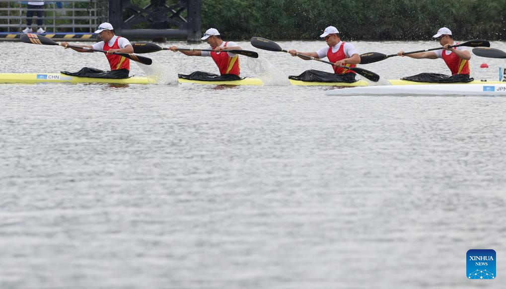Bu Tingkai, Wang Congkang, Zhang Dong and Dong Yi (from L to R) of China compete during the Men's Kayak Four 500m Heat of Canoe Sprint at the 19th Asian Games in Hangzhou, east China's Zhejiang Province, Oct. 1, 2023. (Xinhua/Du Xiaoyi)