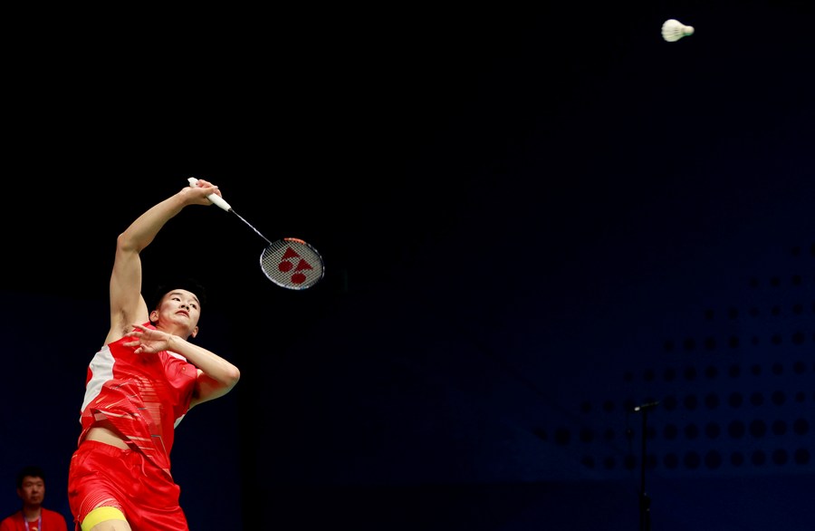 Li Shifeng of China competes in the badminton men's team final against India. (Xinhua/Ren Zhenglai)