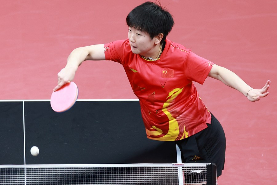 Sun Yingsha of China hits a return during the table tennis women's singles final against Japan's Hina Hayata. (Xinhua/Liu Xu)