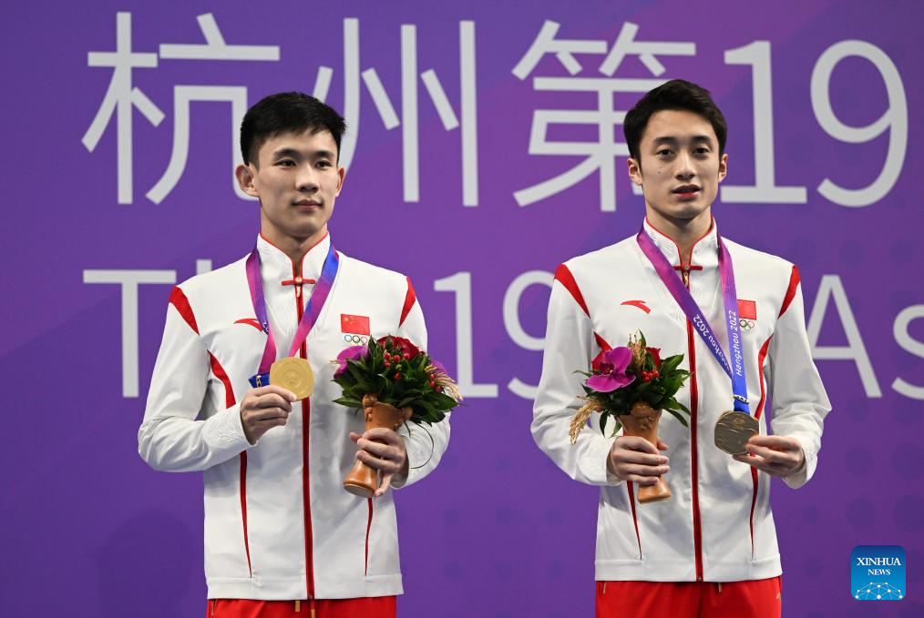 Gold medalists Yang Hao/Lian Junjie of China attend the awarding ceremony for Men's Synchronised 10m Platform of Diving at the 19th Asian Games in Hangzhou, east China's Zhejiang Province,Oct. 1, 2023. (Xinhua/Xia Yifang)