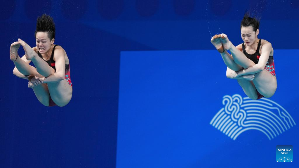 Chen Yiwen (L)/Chang Yani of China compete during the Women's Synchronised 3m Springboard Final of Diving at the 19th Asian Games in Hangzhou, east China's Zhejiang Province, Oct. 1, 2023. (Xinhua/Du yu)