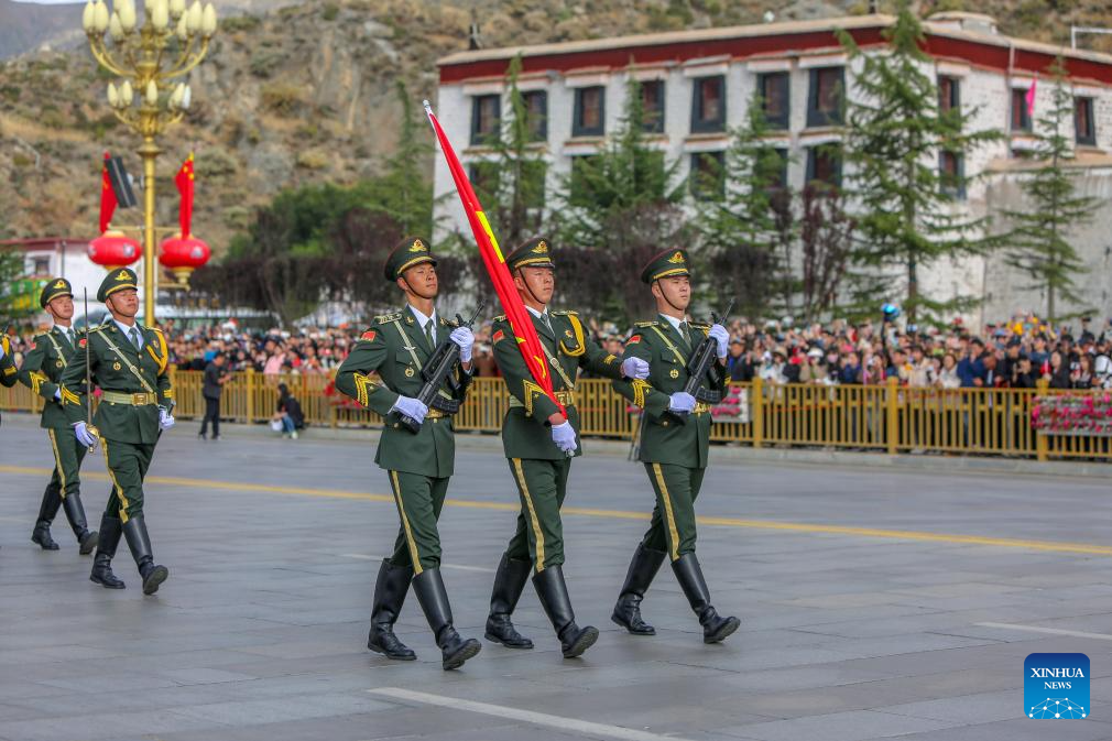 A flag-raising ceremony to celebrate the 74th anniversary of the founding of the People's Republic of China is held at the Potala Palace square in Lhasa, capital of southwest China's Tibet Autonomous Region, Oct. 1, 2023. (Xinhua/Shao Zedong)