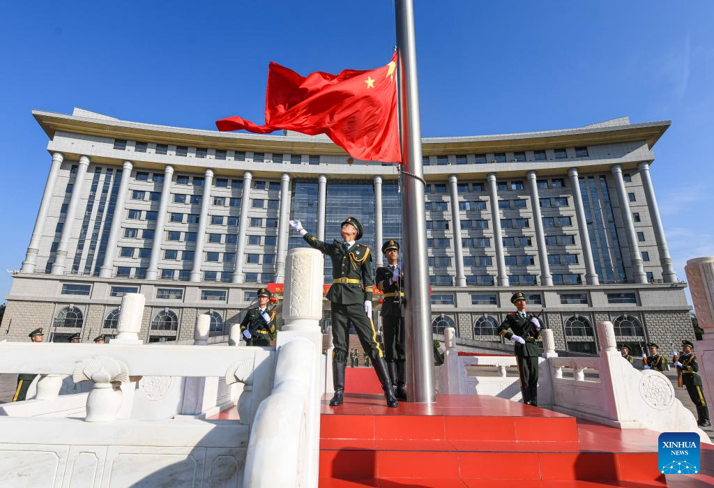 A flag-raising ceremony to celebrate the 74th anniversary of the founding of the People's Republic of China is held at a square in Urumqi, capital of northwest China's Xinjiang Uygur Autonomous Region, Oct. 1, 2023. (Xinhua/Wang Fei)