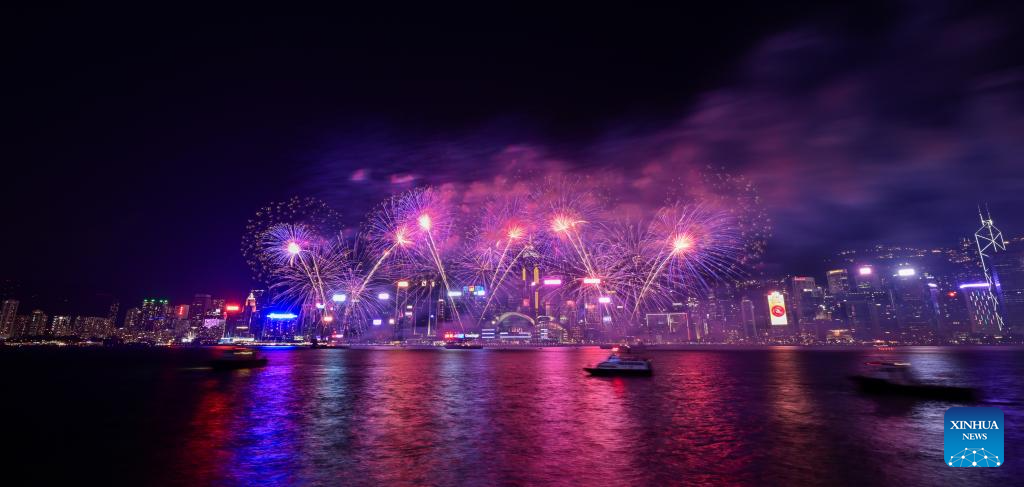 Fireworks celebrating the 74th anniversary of the founding of the People's Republic of China illuminate the sky over Victoria Harbour in Hong Kong, south China, Oct. 1, 2023. (Xinhua/Zhu Wei)