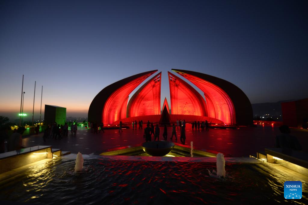 People visit the National Monument illuminated in red color to celebrate the 74th anniversary of the founding of the People's Republic of China, in Islamabad, capital of Pakistan on Oct. 1, 2023. (Xinhua/Ahmad Kamal)