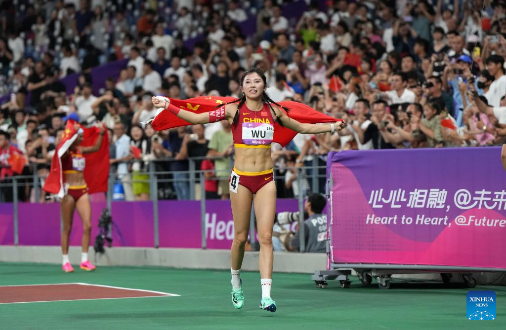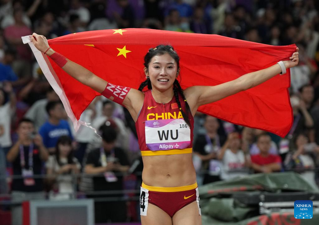 Wu Yanni of China celebrates after the Women's 100m Hurdles Final of Athletics at the 19th Asian Games in Hangzhou, east China's Zhejiang Province, Oct. 1, 2023. (Xinhua/Li Yibo)