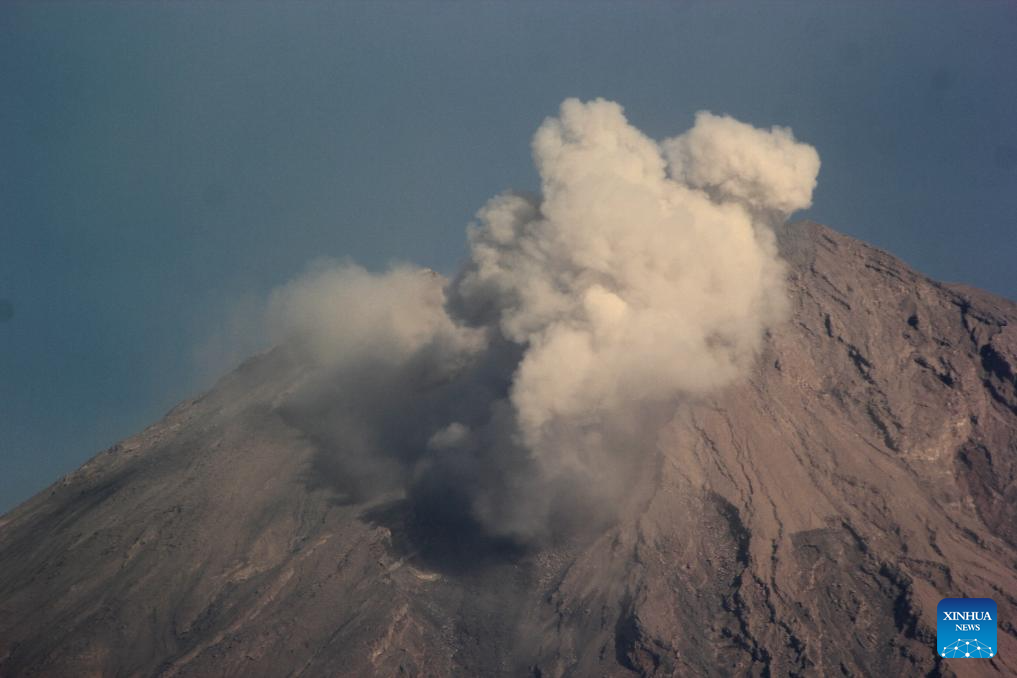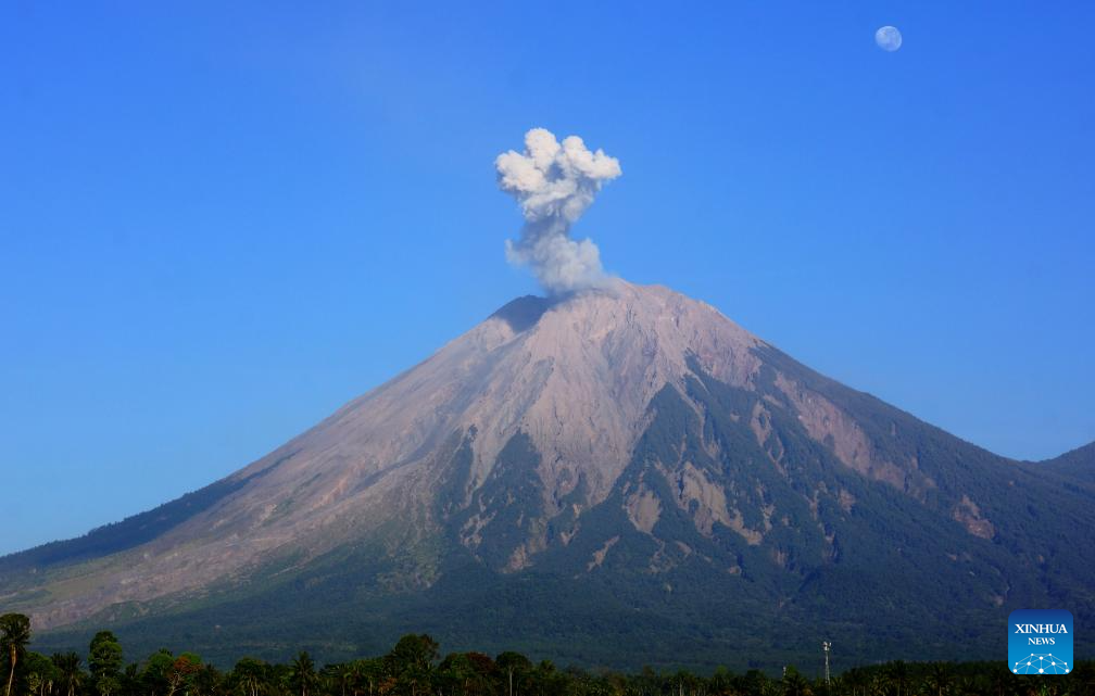 This photo taken on Oct. 1, 2023 shows volcanic materials spewing from Mount Semeru, as seen from Lumajang, East Java, Indonesia. (Photo by Dwi Sasongko/Xinhua)