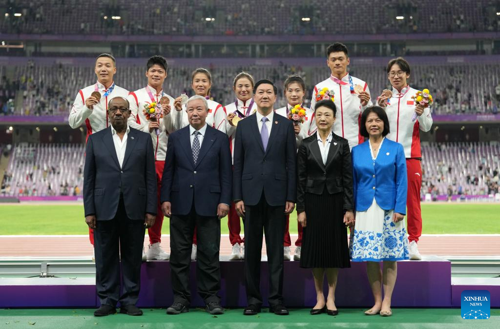 Gold medalist Qieyang Shijie (C), silver medalist Liu Hong (3rd L), bronze medalist Lyu Xiuzhi (3rd R) of China for the Women's 20km Race Walk at the 2012 London Olympic Games, and Bronze medalists Su Bingtian (2nd L), Xie Zhenye (2nd R), Wu Zhiqiang (1st L) and Tang Xingqiang (1st R) of China for the Men's 4 x 100m Relay at the 2020 Tokyo Olympic Games attend the Olympic Medal Reallocation Ceremony in Hangzhou, east China's Zhejiang Province, Oct. 4, 2023. (Xinhua/Sun Fei)