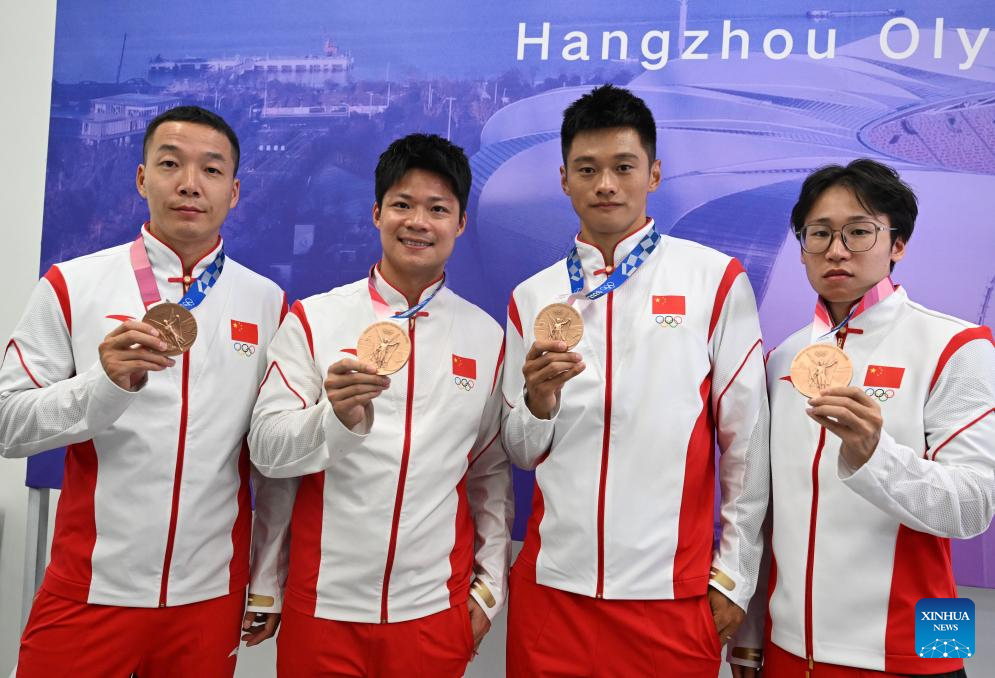 Bronze medalists Wu Zhiqiang, Su Bingtian, Xie Zhenye and Tang Xingqiang (from L to R) of China for the Men's 4 x 100m Relay at the 2020 Tokyo Olympic Games pose for photos after the Olympic Medal Reallocation Ceremony in Hangzhou, east China's Zhejiang Province, Oct. 4, 2023. (Xinhua/Jiang Wenyao)
