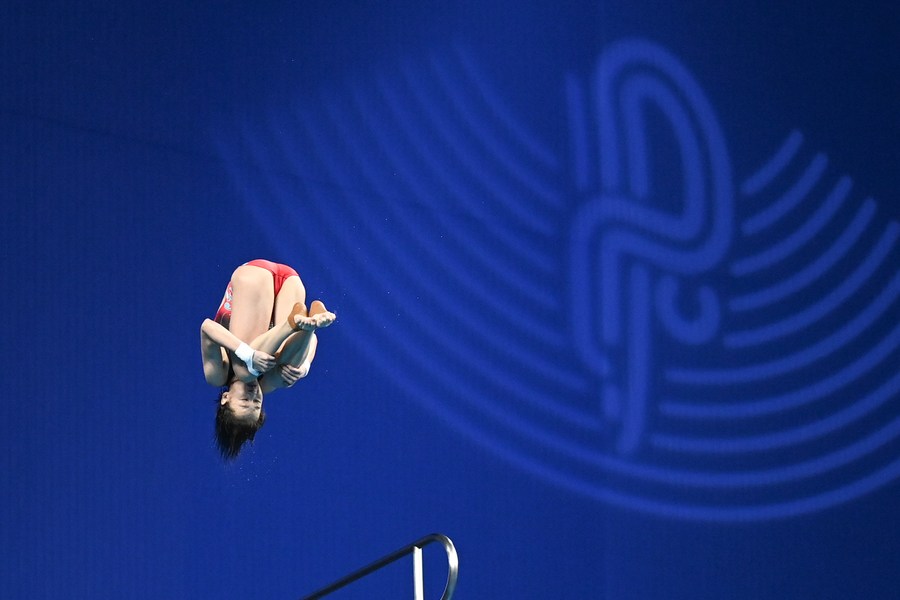 Chinese diver Quan Hongchan competes in the final of the women's 10m platform at the Hangzhou Asian Games on Oct. 3, 2023. (Xinhua/Huang Zongzhi)