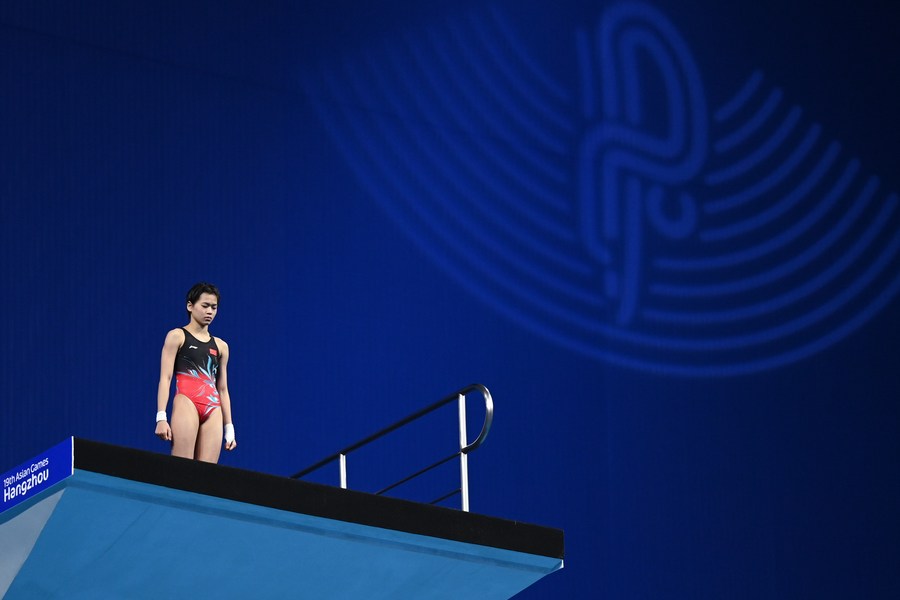 Quan Hongchan competes in the final of the Asiad women's 10m platform on Oct. 3, 2023. (Xinhua/Huang Zongzhi)