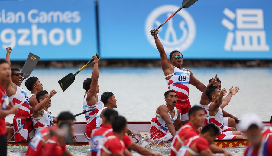 Team Indonesia celebrates after winning the men's 1,000m dragon boat final at the Hangzhou Asian Games on Oct. 6, 2023. (Xinhua/Meng Chenguang)