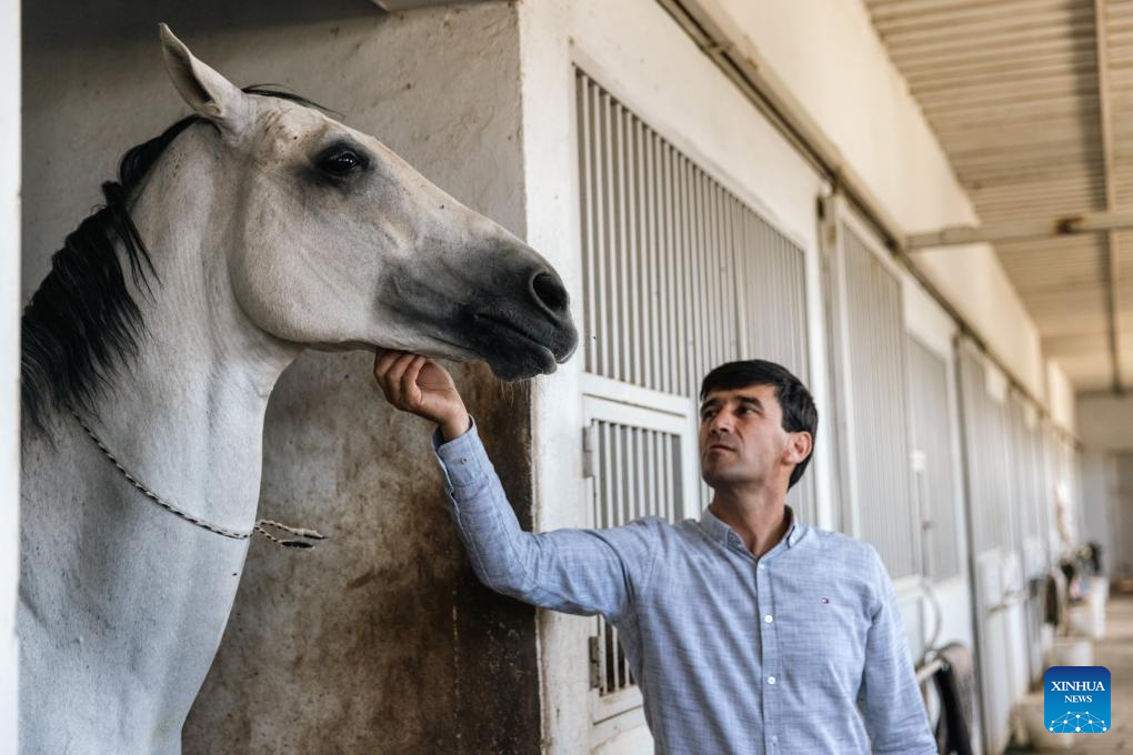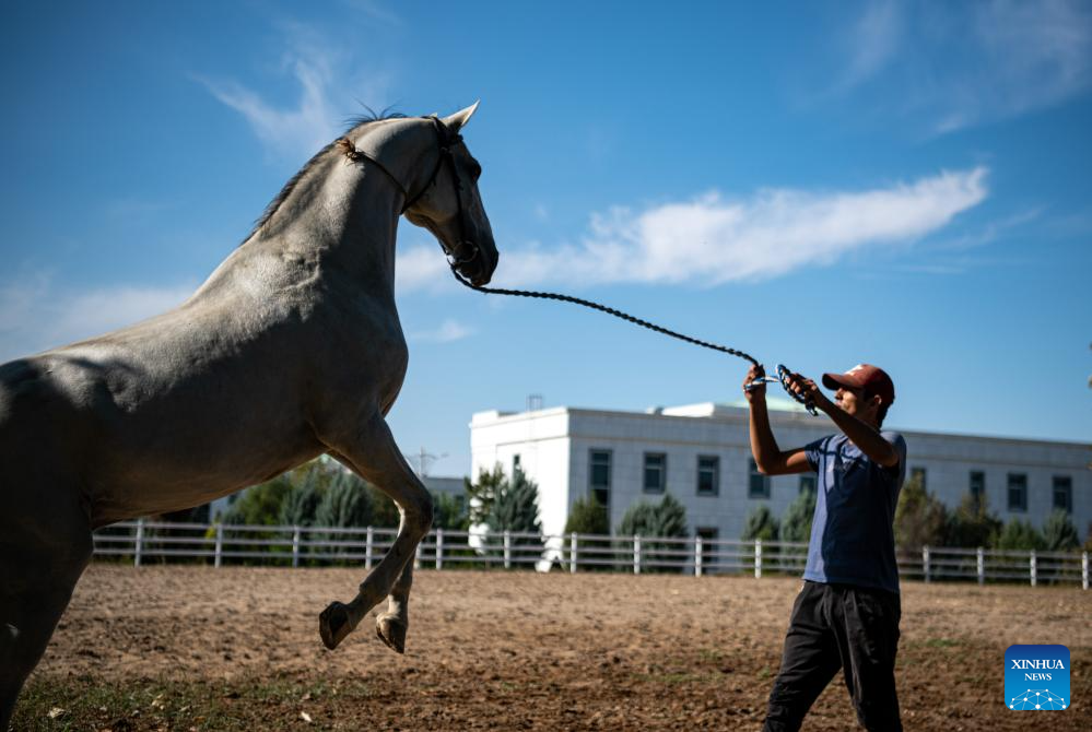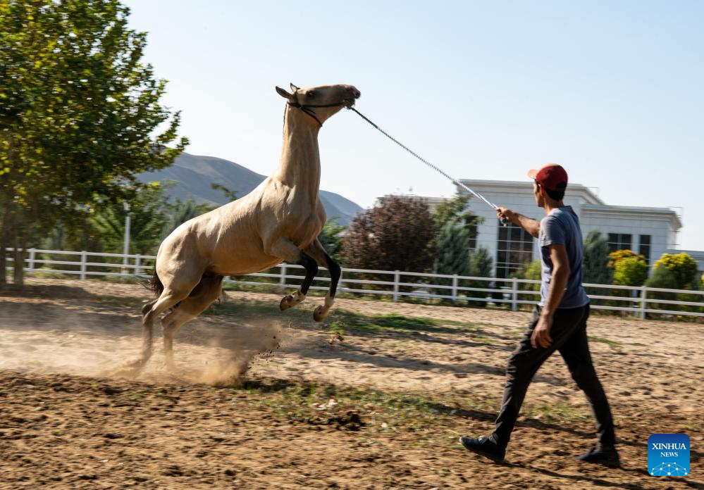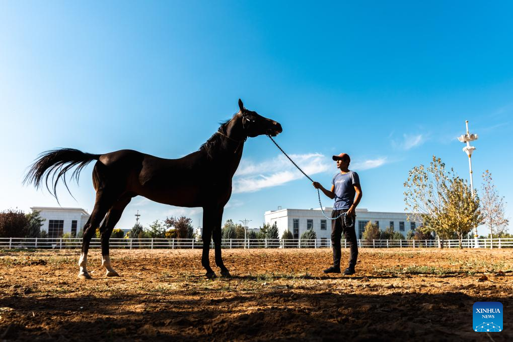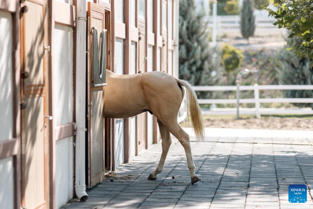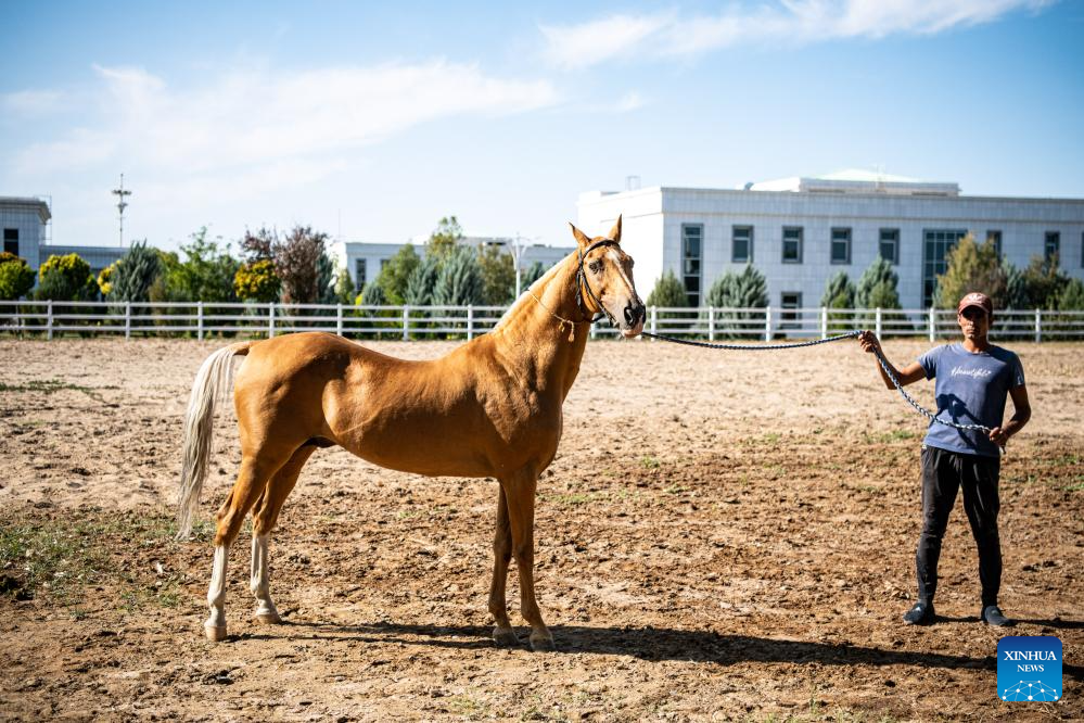 This photo taken on Sept. 26, 2023 shows an Akhal-Teke horse in Ashkhabad, Turkmenistan. Akhal-Teke horse is a national treasure of Turkmenistan and nicknamed "sweat blood horse" in China. (Xinhua/Wu Huiwo)