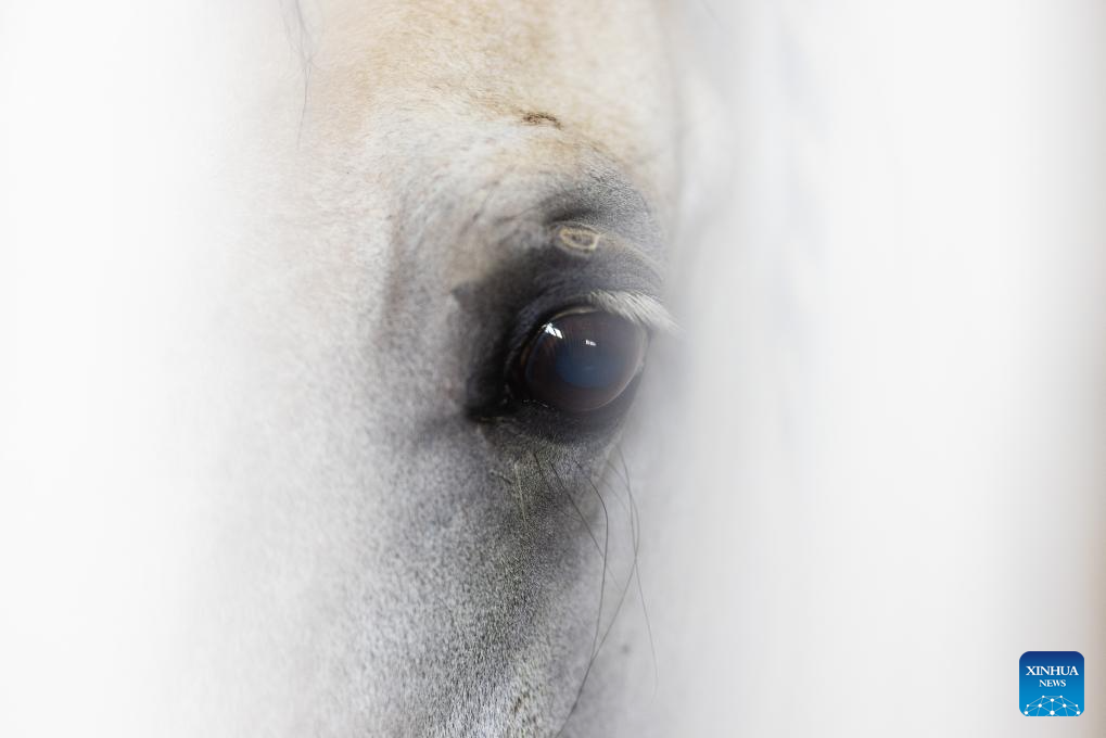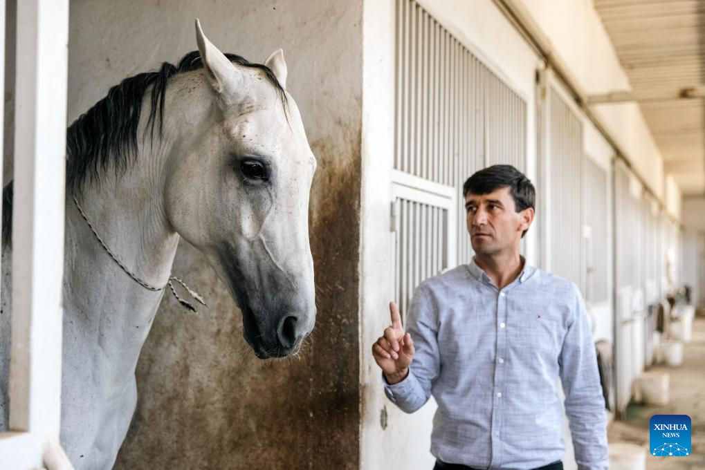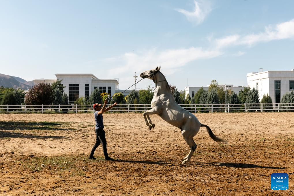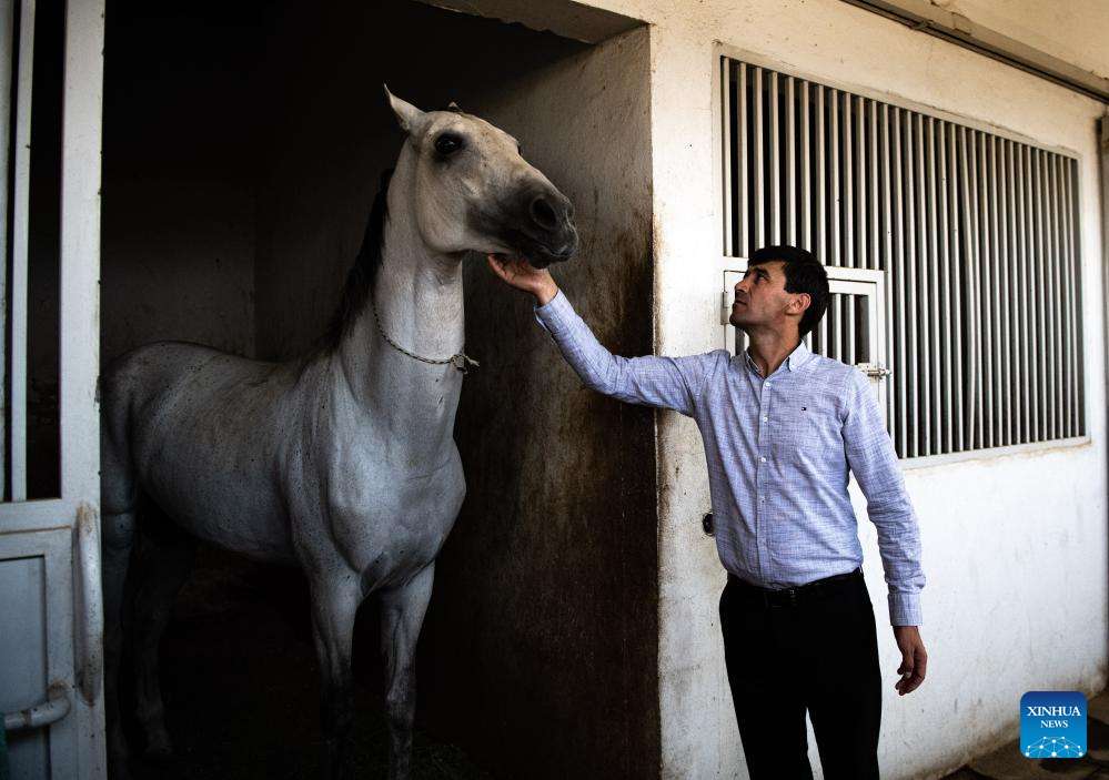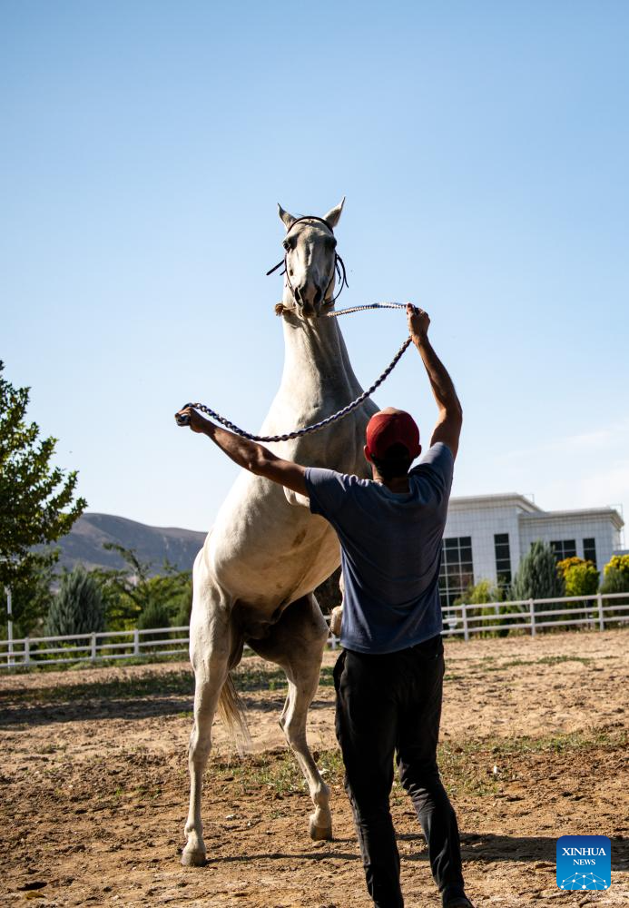 This photo taken on Sept. 26, 2023 shows an Akhal-Teke horse in Ashkhabad, Turkmenistan. Akhal-Teke horse is a national treasure of Turkmenistan and nicknamed "sweat blood horse" in China. (Xinhua/Wu Huiwo)