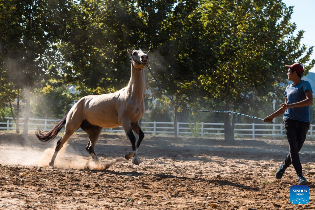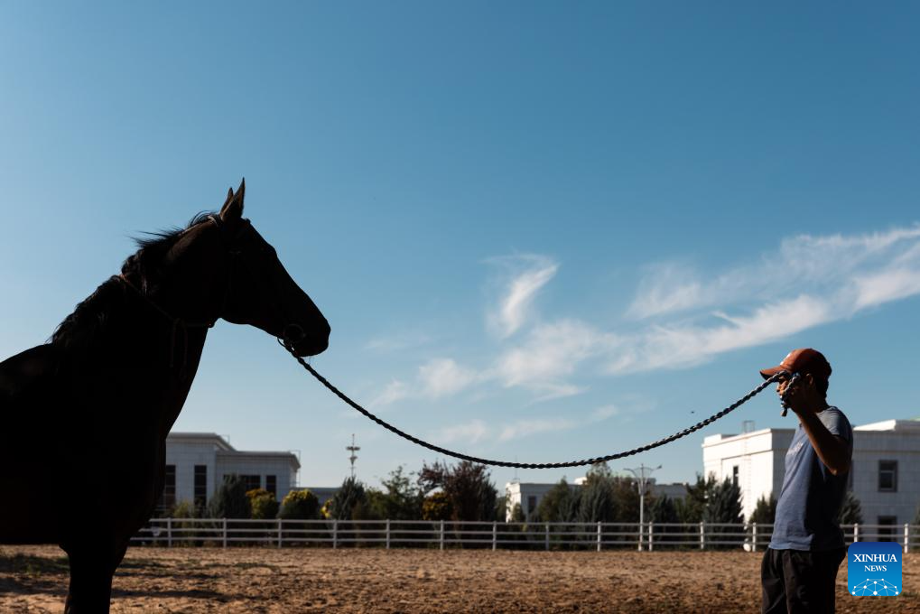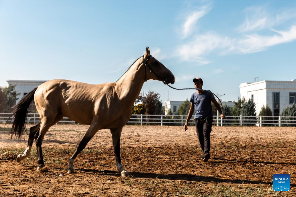 This photo taken on Sept. 26, 2023 shows an Akhal-Teke horse in Ashkhabad, Turkmenistan. Akhal-Teke horse is a national treasure of Turkmenistan and nicknamed "sweat blood horse" in China. (Xinhua/Li Muzi)
