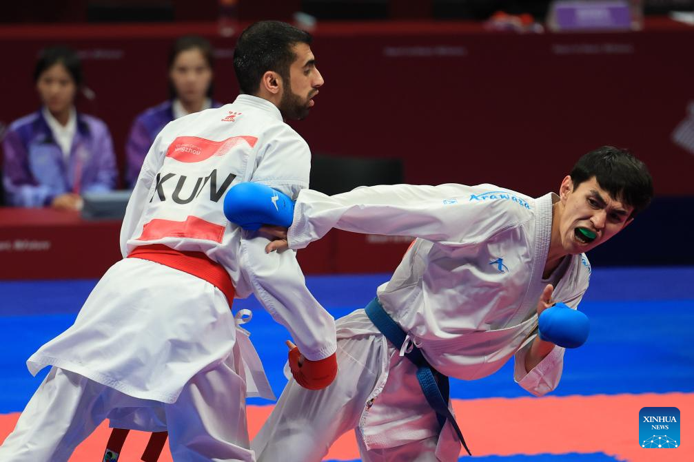 Adilet Shadykanov (L) of Kyrgyzstan competes against Sajad Ganjzadeh of Iran during the Men's Kumite +84kg Gold Medal Contest of Karate at the 19th Asian Games in Hangzhou, east China's Zhejiang Province, Oct. 6, 2023. (Xinhua/Liu Xu)