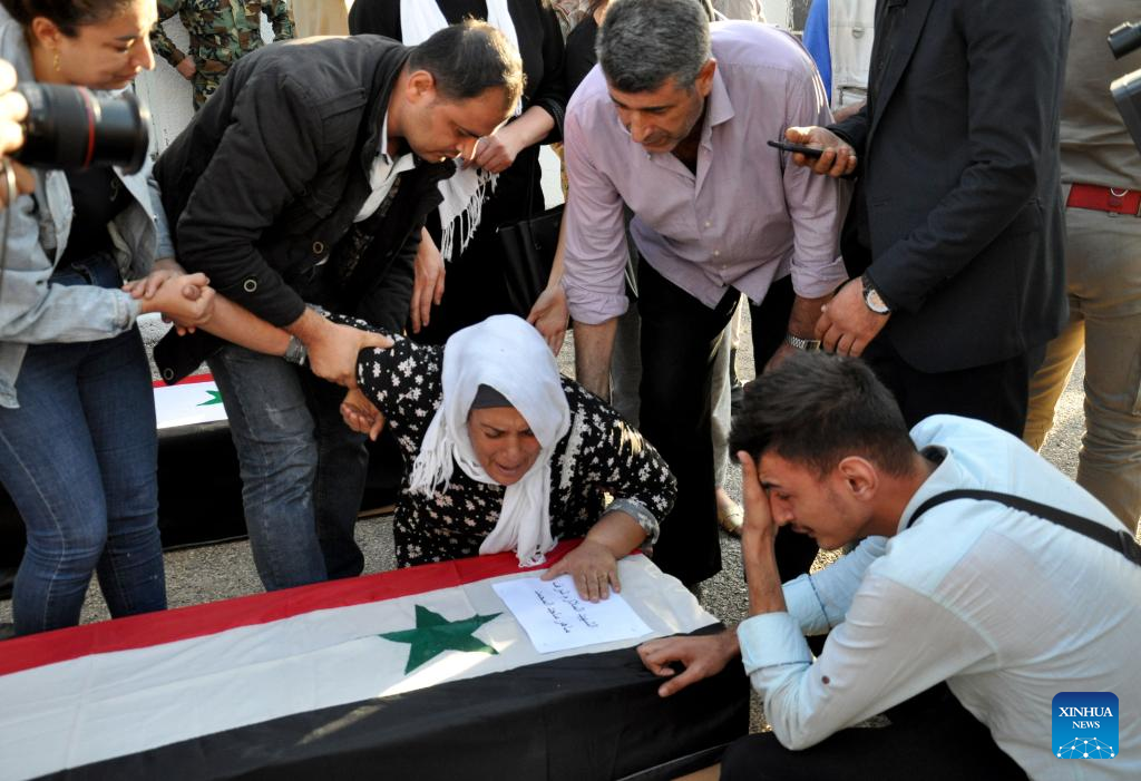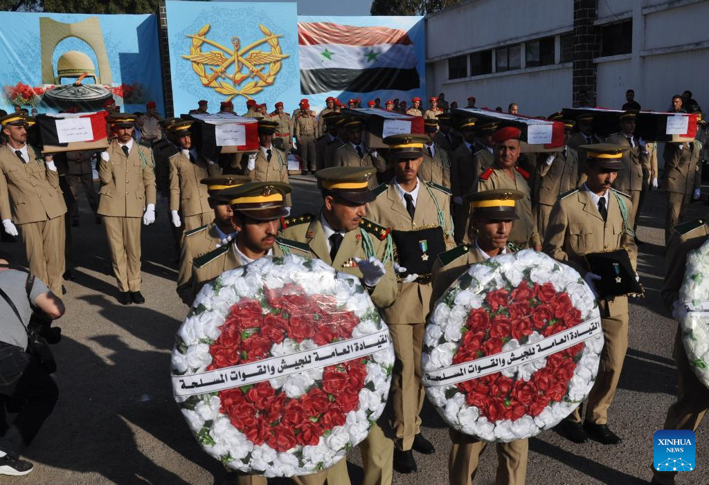 Syrian army members attend a funeral for people killed in a drone attack in Homs, central Syria, Oct. 6, 2023. A drone attack on the Military Academy in Syria's central province of Homs on Thursday has claimed the lives of 80 people and left 240 others injured, said the Syrian Health Ministry. (Str/Xinhua)