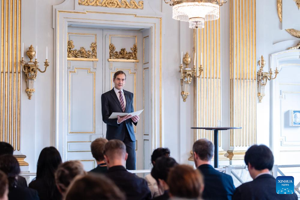 Mats Malm, permanent secretary of the Swedish Academy, announces the winner of 2023 Nobel Prize in Literature in Stockholm, Sweden, Oct. 5, 2023. Norwegian author Jon Fosse won the 2023 Nobel Prize in Literature, the Swedish Academy announced here on Thursday. (Photo by Wei Xuechao/Xinhua)
