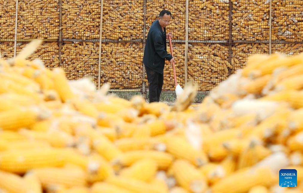 A farmer arranges harvested corns in Sunzhuangzi Village, Xiaozhaozhuang Township, Cangzhou of north China's Hebei Province, Oct. 7, 2023. (Photo by Zhou Yang/Xinhua)
