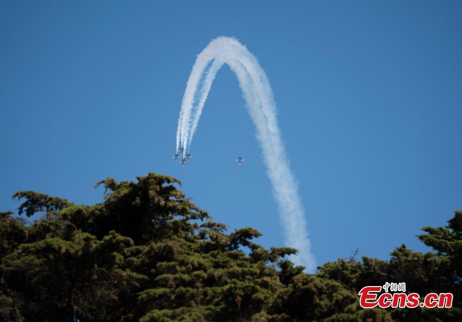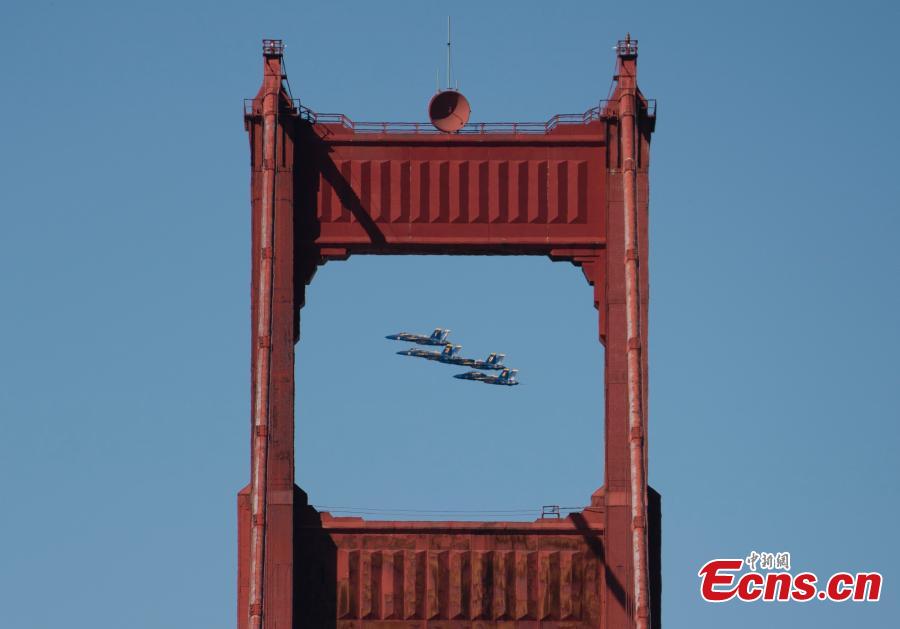 The US Navy Blue Angels fly over the Golden Gate Bridge during the Fleet Week air show in San Francisco, California, U.S., Oct. 6, 2023. (Photo: China News Service/Liu Guanguan)