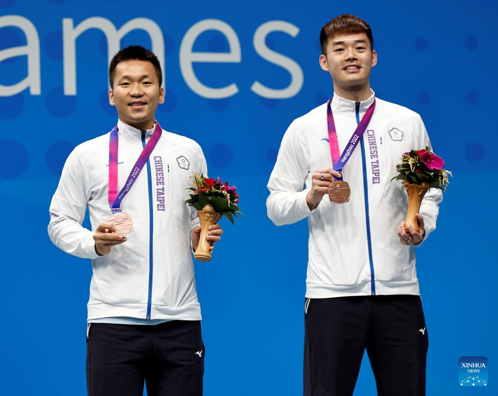 Bronze medalists Wang Chi-Lin (R)/Lee Yang of Chinese Taipei attend the awarding ceremony for the Men's Doubles of Badminton at the 19th Asian Games in Hangzhou, east China's Zhejiang Province, Oct. 7, 2023. (Xinhua/Ren Zhenglai)